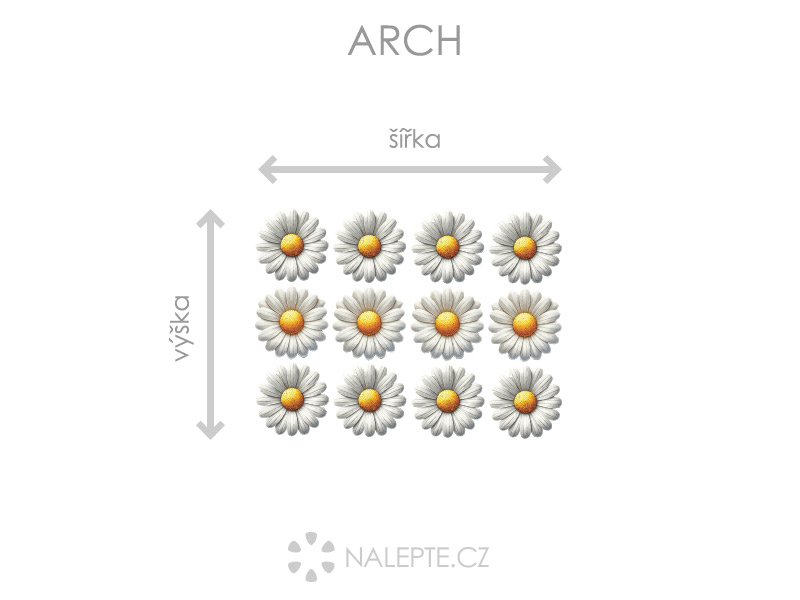Arch = takto vám bude samolepka doručena. Každý prvek na archu je samostatná samolepka, jednotlivé části jednoduše od papírového podkladu odlepíte a nalepíte na zeď tak, aby složily výsledný motiv dle Vašich představ. Arch si můžete prohlédnout ve fotogalerii. Rozměr archu volíte v objednávce. Přehled předdefinovaných rozměrů (šířka x výška): - 12 ks 4 x 4 cm - 12 ks 6 x 6 cm - 12 ks 10 x 10 cm - 12 ks 18 x 18 cm - 12 ks 24 x 24 cm Je možné zvolit i libovolný vlastní rozměr archu pomocí posuvníku či klikání na "Větší", "Menší"