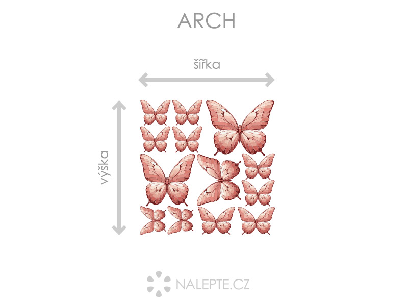 Arch = takto vám bude samolepka doručena. Každý prvek na archu je samostatná samolepka, jednotlivé části jednoduše od papírového podkladu odlepíte a nalepíte na zeď tak, aby složily výsledný motiv dle Vašich představ. Arch si můžete prohlédnout ve fotogalerii. Rozměr archu volíte v objednávce. Přehled předdefinovaných rozměrů (šířka x výška): a) arch 20 x 20 cm b) arch 30 x 30 cm c) arch 45 x 45 cm d) arch 75 x 75 cm Například nejmenší arch 20 x 20 cm obsahuje 1 ks šíře 10 cm, 2 ks šíře 8 cm, 2 ks šíře 5,5 cm, 8 ks šíře cca 4 až 4,5 cm Je možné zvolit i libovolný vlastní rozměr archu pomocí posuvníku či klikání na "Větší", "Menší"