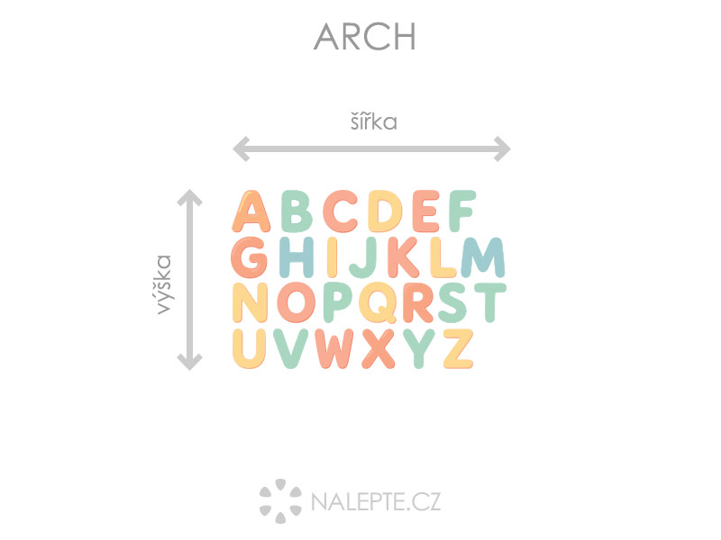 Arch = takto vám bude samolepka doručena. Každý prvek na archu je samostatná samolepka, jednotlivé části jednoduše od papírového podkladu odlepíte a nalepíte na zeď tak, aby složily výsledný motiv dle Vašich představ. Arch si můžete prohlédnout ve fotogalerii. Rozměr archu volíte v objednávce. Přehled předdefinovaných rozměrů (šířka x výška): a) arch 46 x 30 cm b) arch 75 x 49 cm c) arch 100 x 65 cm d) arch 153 x 100 cm Je možné zvolit i libovolný vlastní rozměr archu pomocí posuvníku či klikání na "Větší", "Menší" Výška písmene odpovídá jedné čtvrtině výšky archu.