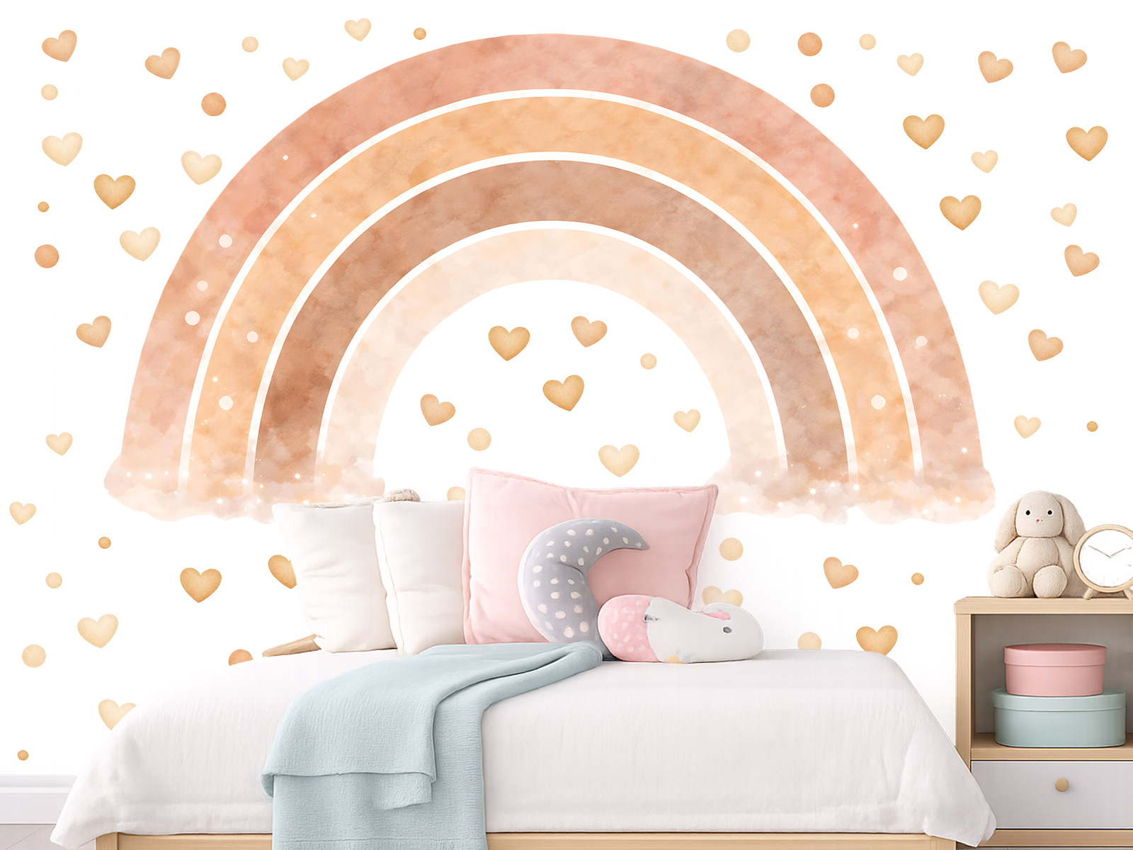 Akvarelová duha boho vnese do dětského pokojíčku jemnou, klidnou a hřejivou atmosféru inspirovanou boho stylem. Ručně malovaný akvarelový vzhled v přírodních tónech béžové, pudrové a teplé broskvové působí velmi lehce a nadčasově, díky čemuž se samolepka krásně hodí jak do miminkovských pokojů, tak i pro větší děti. Duha je doplněna drobnými srdíčky, která dodávají celé kompozici něžný a hravý detail, aniž by působila rušivě. Motiv je navržen tak, aby na zdi působil vzdušně a přirozeně, snadno se stal dominantou nad postýlkou či postelí a zároveň harmonicky ladil s ostatními dekoracemi. Součástí balení je arch s jednotlivými prvky v uvedených rozměrech, které umožňují vytvořit si vlastní rozložení podle prostoru a fantazie, a dodat tak interiéru osobitý, pohádkově klidný charakter.