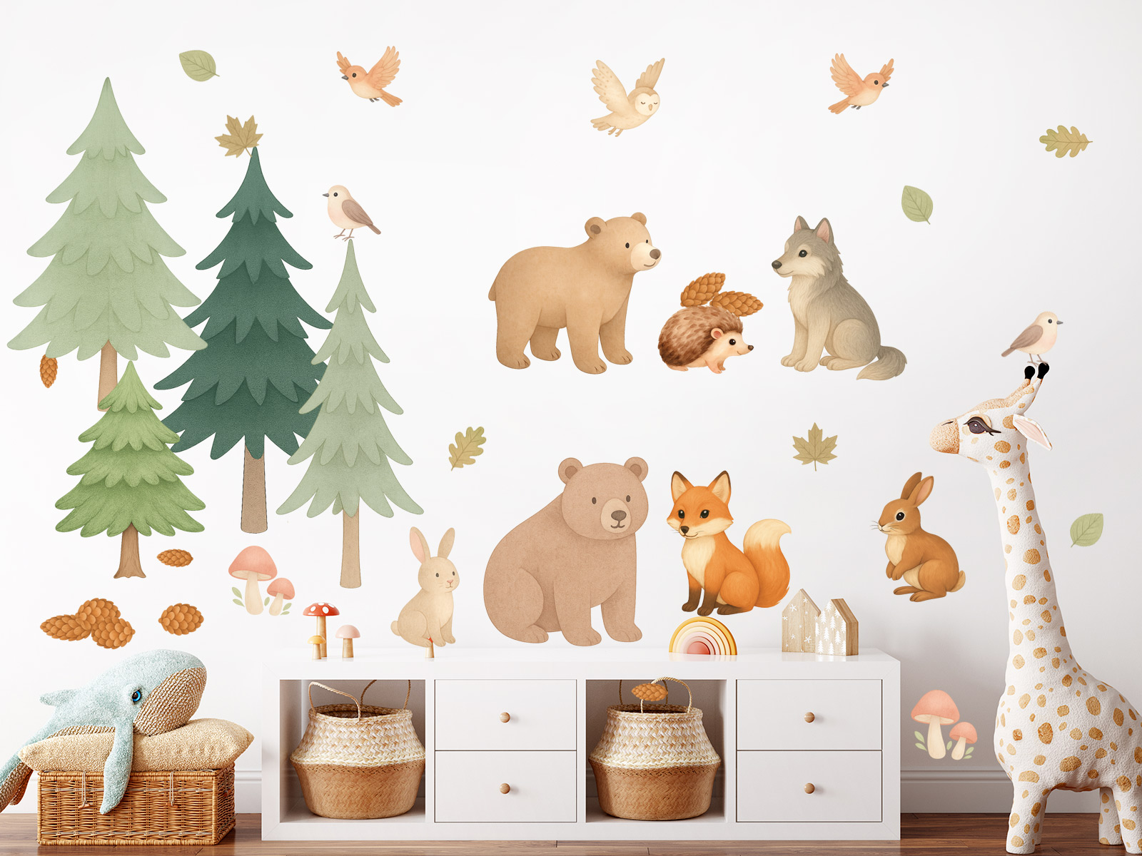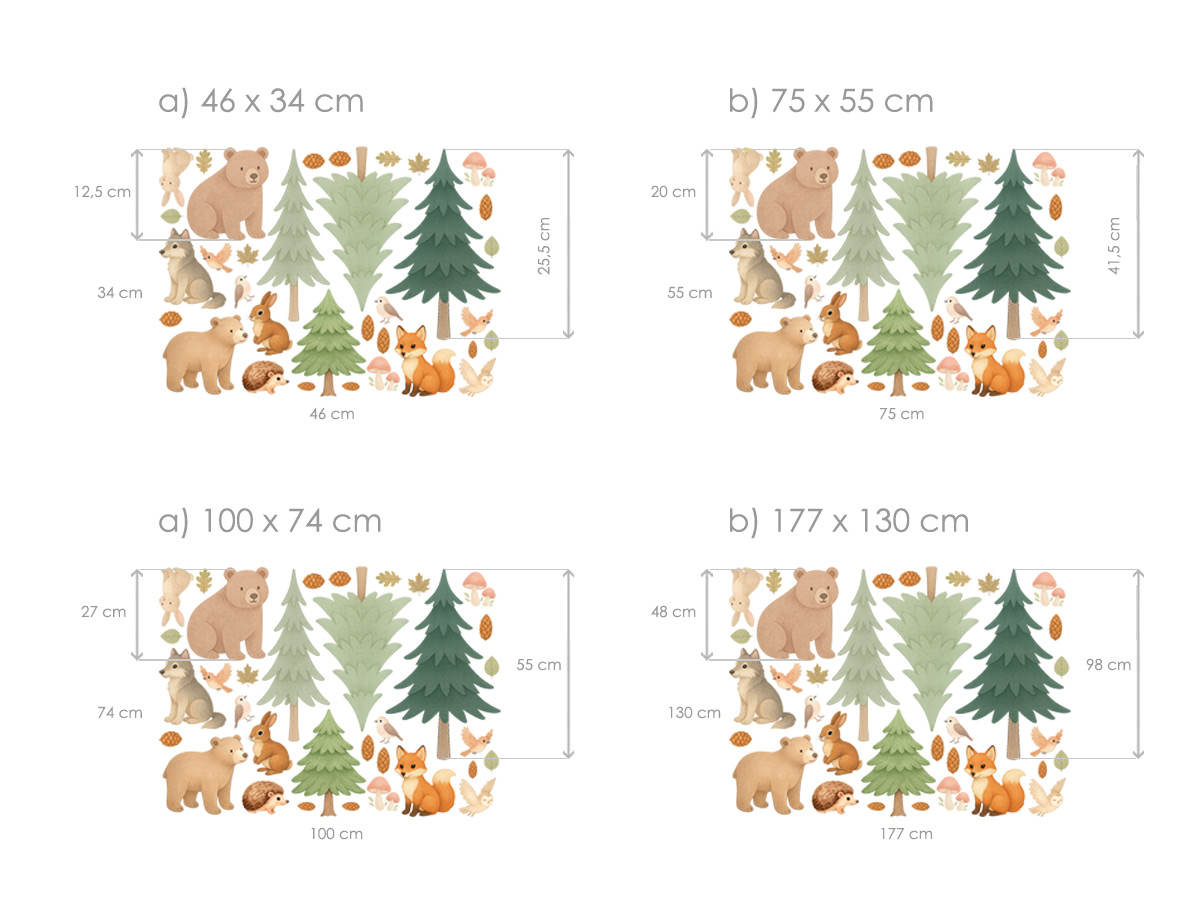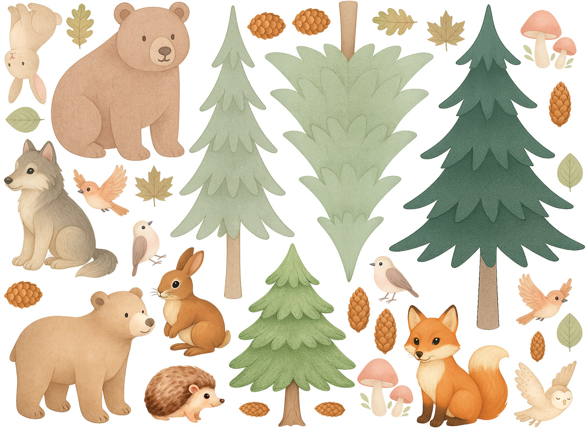 Vneste do dětského pokojíčku kouzlo lesa! Naše sada Akvarelová lesní zvířátka promění každou stěnu v jemnou přírodní scénu plnou roztomilých zvířátek, stromů a lesních detailů. Všechny motivy jsou ručně ilustrované v jemném akvarelovém stylu, působí hřejivě, klidně a harmonicky – ideální pro útulné a hravé prostředí dětského pokoje. Co sada obsahuje: - 2 medvídky - lišku, vlčka, ježka, zajíčky a ptáčky - 3 různé smrčky - houbičky, šišky a listy jako doplňky pro dotvoření celé scény Motivy lze libovolně kombinovat a rozmístit podle velikosti stěny či osobní fantazie – vytvoříte si vlastní lesní pohádku.