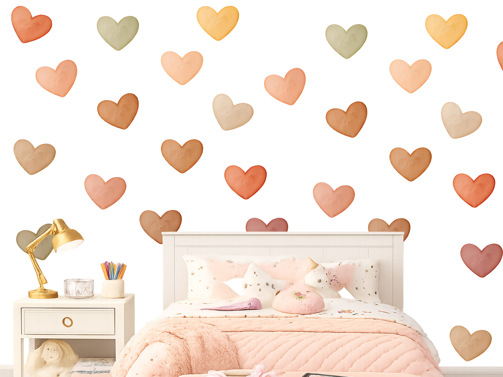 Samolepky na zeď Akvarelová boho srdce jsou jemnou a stylovou dekorací, která vyniká přirozenými zemitými odstíny inspirovanými přírodou. Kombinace teplých tónů béžové, karamelové, meruňkové, jemné zelené a tlumené červené vytváří harmonický boho styl, který působí klidně, útulně a nadčasově. Díky akvarelovému zpracování mají srdíčka měkké barevné přechody a jemnou strukturu, takže působí jako ručně malovaná. Dekorace se skvěle hodí do dětských pokojů, pokojů pro miminka nebo do interiérů laděných v přírodním či skandinávském stylu. Velmi dobře doplní dřevěný nábytek, neutrální textilie a přírodní dekorace. Samolepky můžete rozmístit podle vlastní fantazie – rovnoměrně po celé stěně, vytvořit jemný vzor nad postýlkou nebo dekorovat jen část stěny. Výsledkem je útulná a harmonická atmosféra, která dodá dětskému pokoji osobitý a hřejivý charakter.