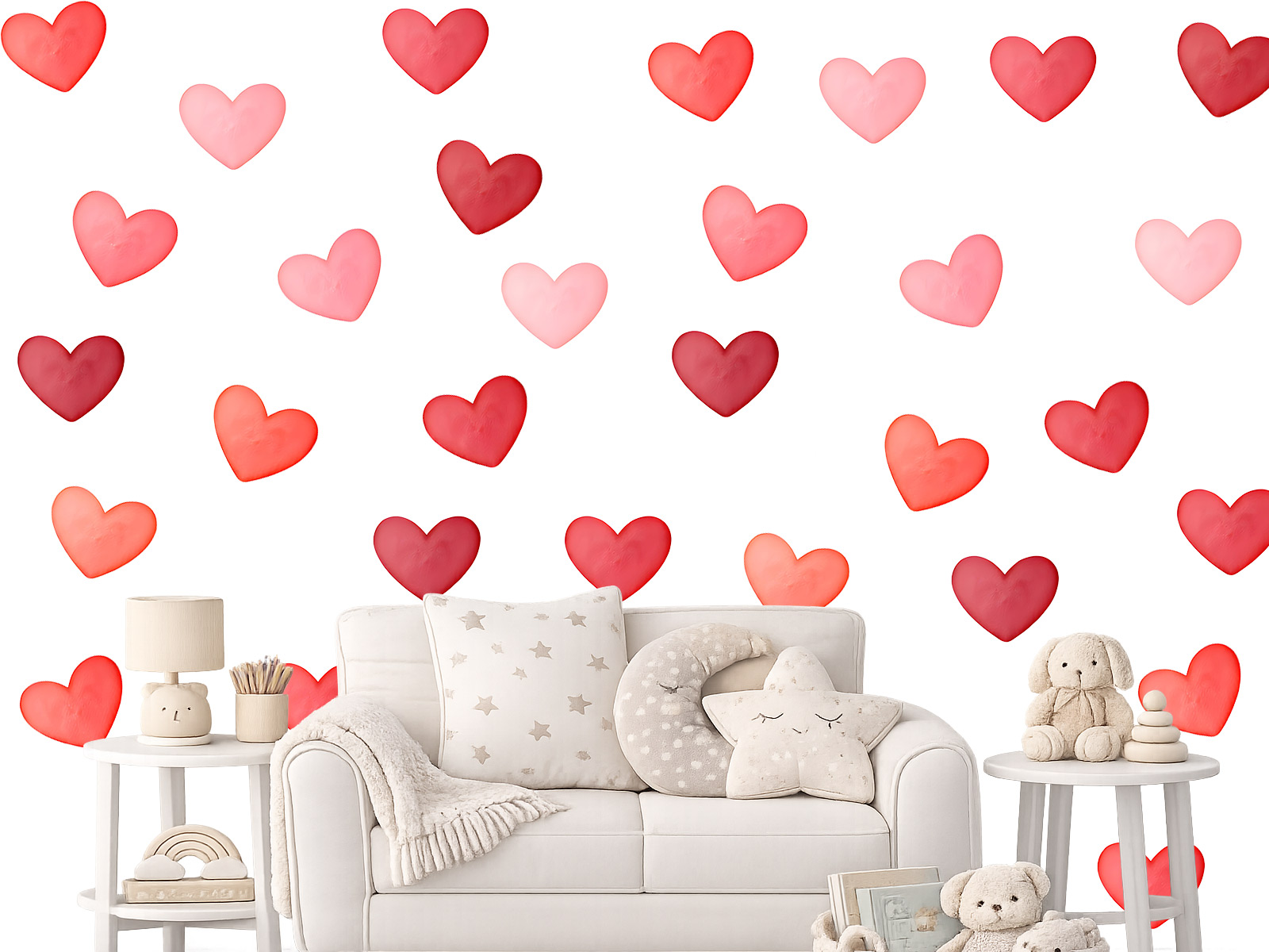 Samolepky na zeď Akvarelová červená srdce jsou výraznou a romantickou dekorací, která dodá interiéru hřejivou a radostnou atmosféru. Kombinace různých odstínů červené, od jemně růžové až po sytější červené tóny, vytváří krásný akvarelový efekt, díky kterému srdíčka působí jemně a přirozeně, jako by byla ručně malovaná. Tyto samolepky na zeď jsou ideální do dětských pokojů, ale skvěle se hodí také jako dekorace do dívčích pokojů nebo do interiérů, kde chcete vytvořit hravou a romantickou atmosféru. Červené tóny dodávají prostoru energii, teplo a pocit radosti, zároveň však díky akvarelovému stylu nepůsobí příliš výrazně. Samolepky můžete rozmístit podle vlastní fantazie. Srdíčka lze rozprostřít po celé stěně, vytvořit pravidelný vzor nebo jen jemnou dekoraci nad postelí či v dětském koutku. Výsledkem je jednoduchá, ale velmi efektní dekorace, která promění místnost v útulné místo plné barev a pozitivní energie.