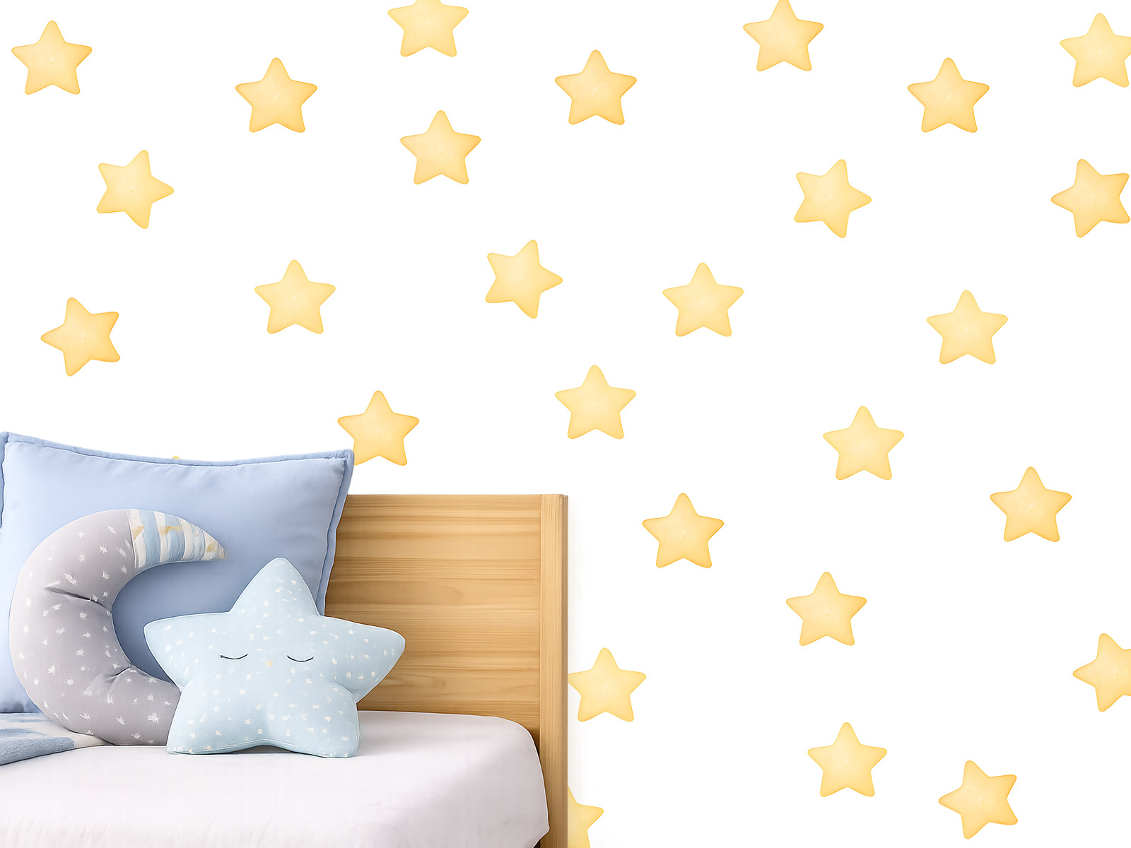 Samolepky na zeď Akvarelové žluté hvězdy jsou veselou a hřejivou dekorací, která dokáže krásně rozjasnit dětský pokoj. Jemné odstíny žluté působí optimisticky a připomínají sluneční paprsky nebo hvězdy na večerní obloze. Díky akvarelovému stylu mají hvězdičky měkké barevné přechody a malovaný vzhled, který na stěně působí velmi jemně a přirozeně.