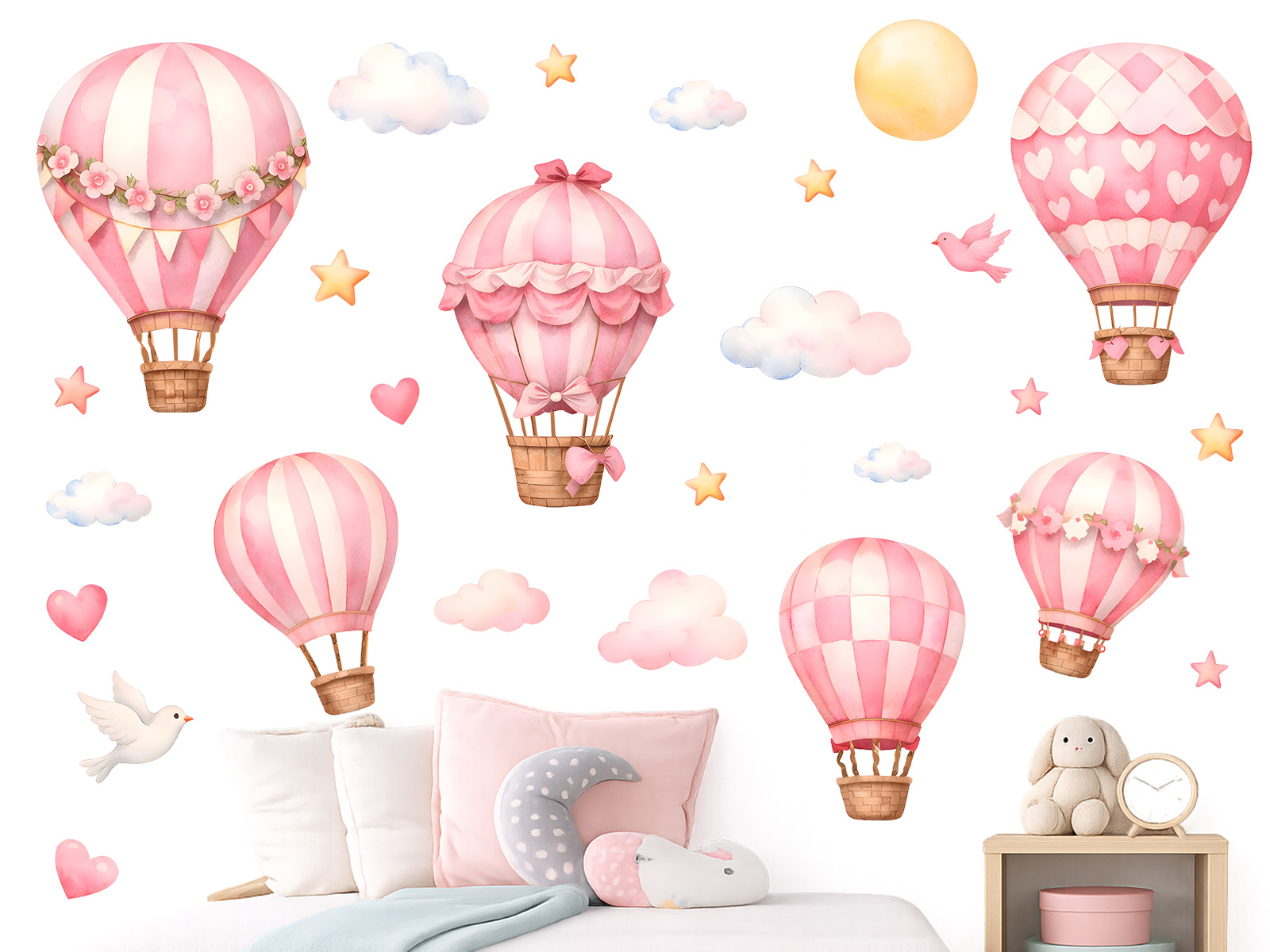 Jemné akvarelové samolepky na zeď s růžovými létajícími balóny promění dětský pokoj v klidné a snové místo plné něhy, fantazie a bezpečí. Pastelové barvy, hebké tvary obláčků i drobná srdíčka vytvářejí harmonickou atmosféru, ve které se děti cítí šťastně, uvolněně a mohou se každý den vydávat na kouzelnou cestu do světa představivosti. Tento něžný motiv je ideální pro miminka i malé princezny a krásně doplní postýlku, koutek na hraní i první dětské sny. Samolepky na zeď s balóny přinášejí do interiéru lehkost, radost a pocit láskyplného domova, který bude vaše dítě obklopovat od prvních okamžiků.