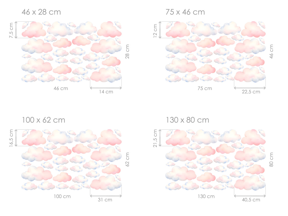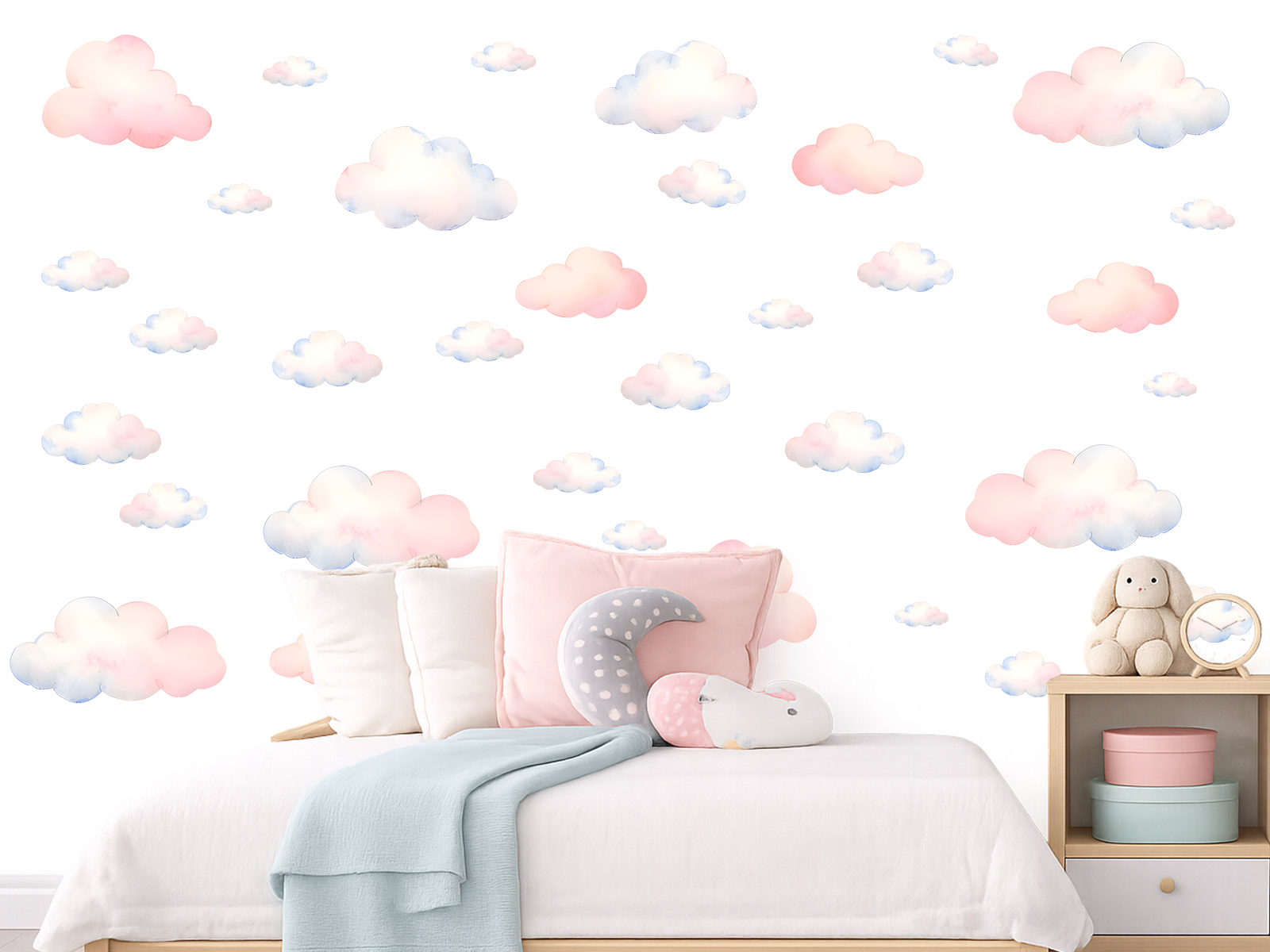 Akvarelové obláčky v jemných pastelových tónech vytvářejí v dětském pokoji lehkou, vzdušnou a klidnou atmosféru. Kombinace růžových a modrých odstínů působí něžně a harmonicky, takže prostor získá pocit svěžesti a pohody. Motiv obláčků navozuje dojem klidné oblohy, pod kterou se krásně odpočívá, sní i usíná. Celá kompozice působí jemně a nenápadně, přesto dokáže stěnu proměnit v hravý a útulný prostor plný fantazie. Akvarelové obláčky se snadno stanou součástí dětského světa, kde každý den může začínat i končit pod měkkou, pastelovou oblohou.
