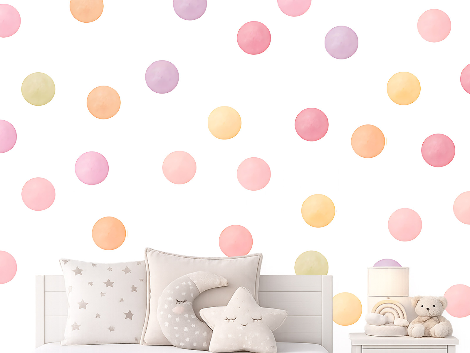 Velkou výhodou je možnost rozmístit samolepky na zeď přesně podle vlastní fantazie. Puntíky můžete rozprostřít po celé stěně, vytvořit pravidelný vzor nebo jen jemný dekor nad postýlkou či dětskou postelí. Díky různým pastelovým odstínům vznikne na stěně hravý a zároveň harmonický efekt, který dodá dětskému pokoji útulnost, jemnost a jedinečný styl.