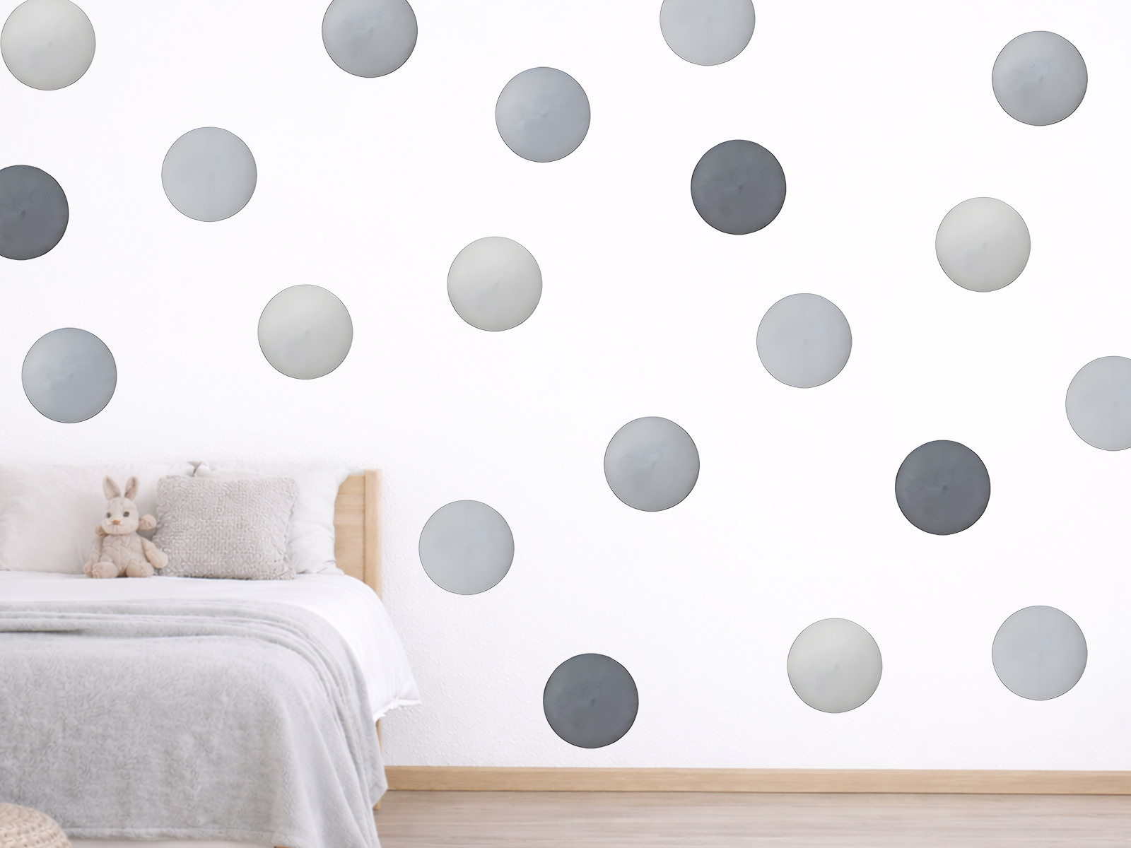 Akvarelové šedé puntíky jsou jemnou a elegantní dekorací, která dodá interiéru moderní a klidný vzhled. Různé odstíny šedé vytvářejí na stěně harmonický a přirozený efekt, který působí velmi vkusně a nadčasově. Díky akvarelovému stylu mají puntíky měkké barevné přechody a malovaný vzhled, takže dekorace nepůsobí tvrdě ani výrazně, ale spíše jemně doplňuje celý prostor.