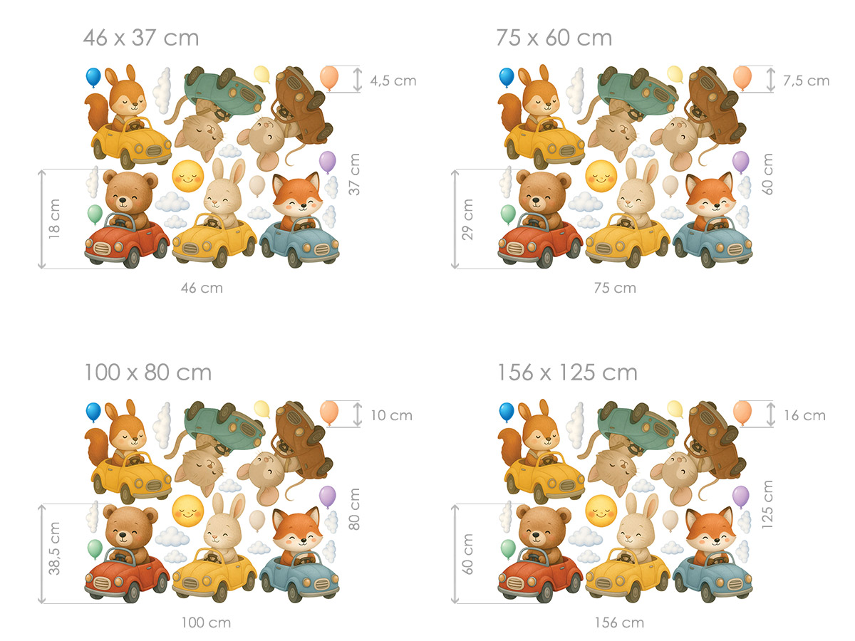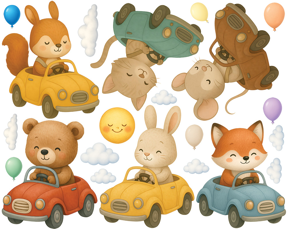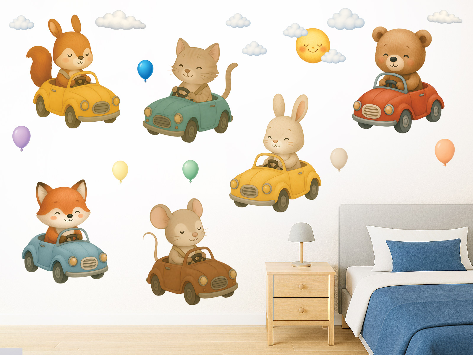 Samolepky na zeď „Auta a zvířátka“ přinesou do dětského pokoje radost, barvy a hravost. Veselá parta zvířátek – lištička, medvídek, králíček, myška, kočička a veverka – vyráží na dobrodružnou projížďku ve svých pestrobarevných autíčkách, zatímco kolem poletují balónky, obláčky a usměvavé sluníčko. Každý motiv je pečlivě zpracován v jemných pastelových barvách, které působí uklidňujícím a přátelským dojmem. Balení obsahuje arch s jednotlivými motivy, které lze kreativně kombinovat a vytvořit tak originální scénu přesně pro váš interiér. Ideální doplněk pro dětské pokoje, herny i školky.