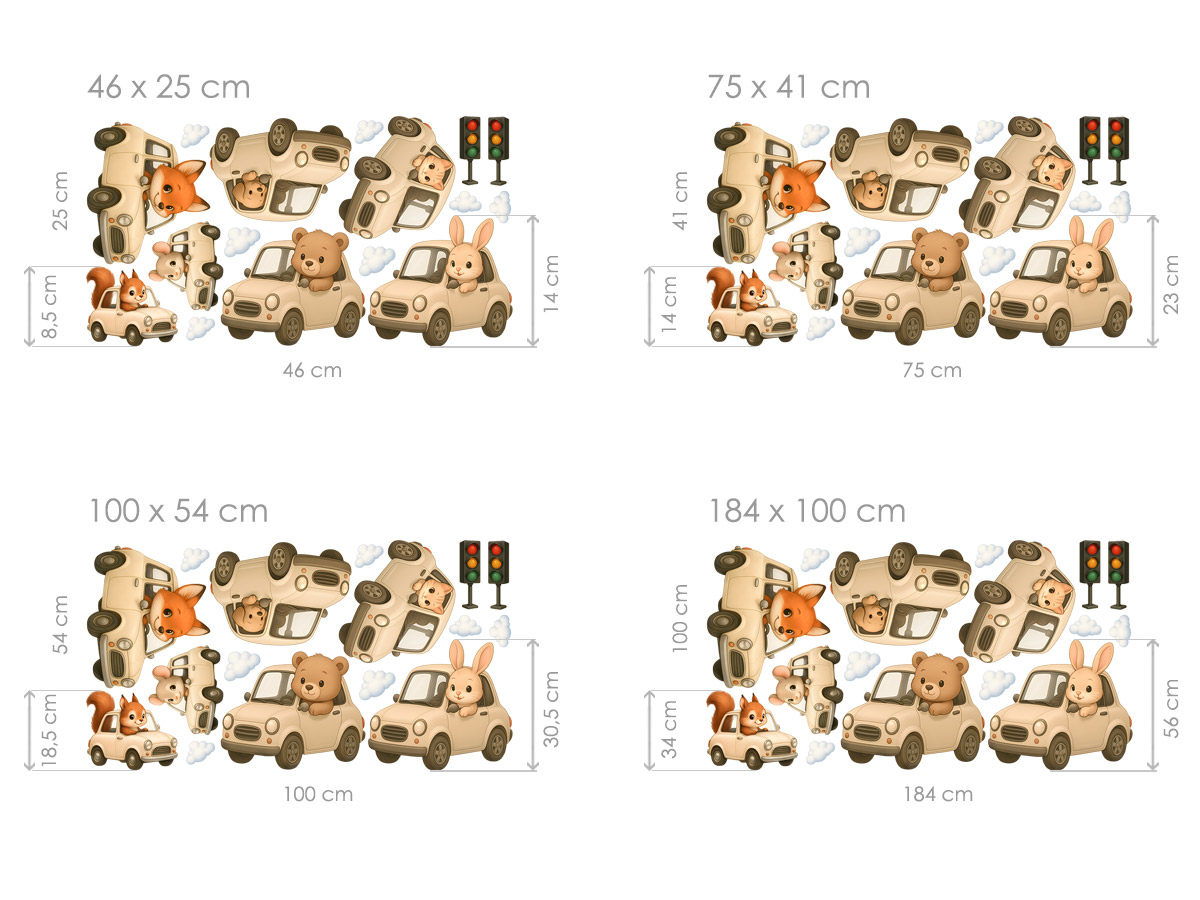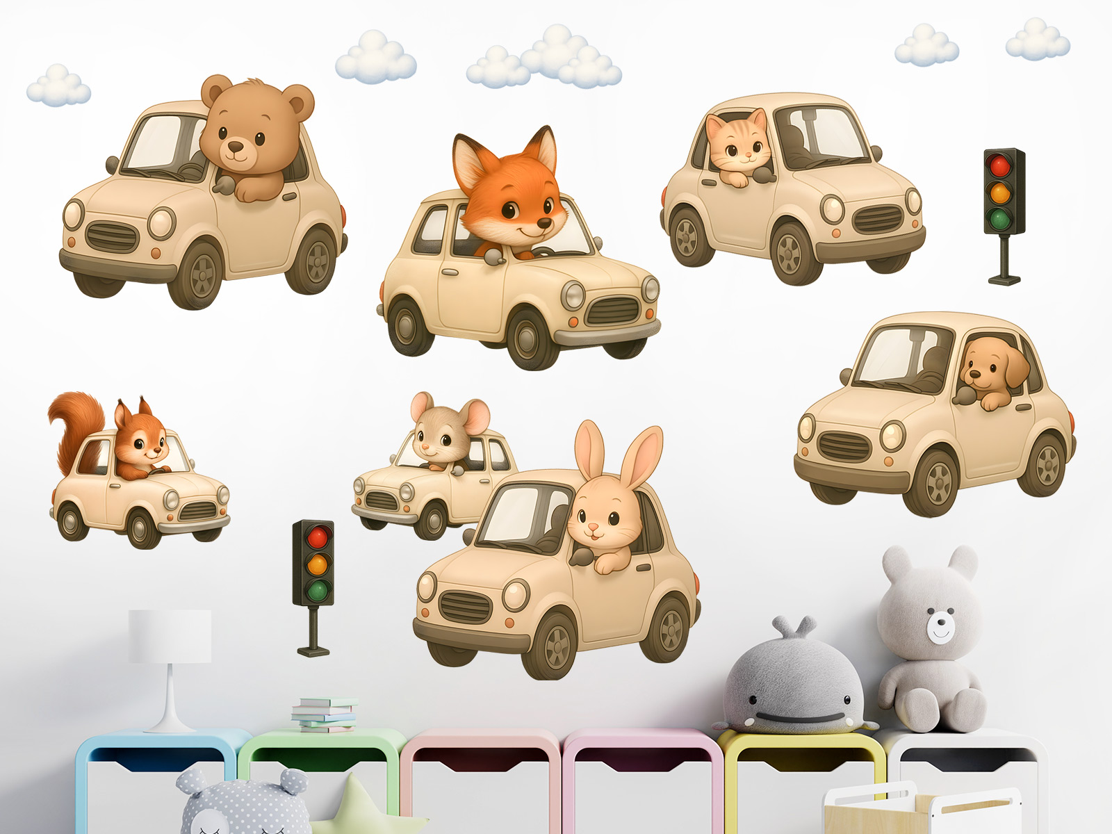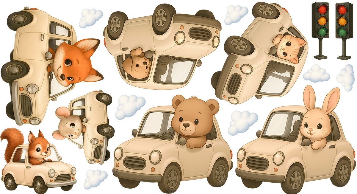 Samolepka na zeď „Autíčka pro děti“ přináší do dětského pokoje roztomilý svět plný klidné jízdy, fantazie a přátelských zvířecích kamarádů. Veverka, liška, medvídek, králíček i myška se vydávají na cestu ve svých béžových autíčkách s kulatými tvary, které působí jemně a bezpečně. Každý motiv je vytvořen v měkkém pastelovém stylu, který skvěle zapadne do moderních pokojíčků. Nechybí ani malé obláčky a semafory, díky nimž lze na stěně vytvářet vlastní dopravní scénu. Tento set je ideální pro děti milující autíčka i zvířátka a krásně oživí každý pokojíček jemným, hravým a přátelským designem.