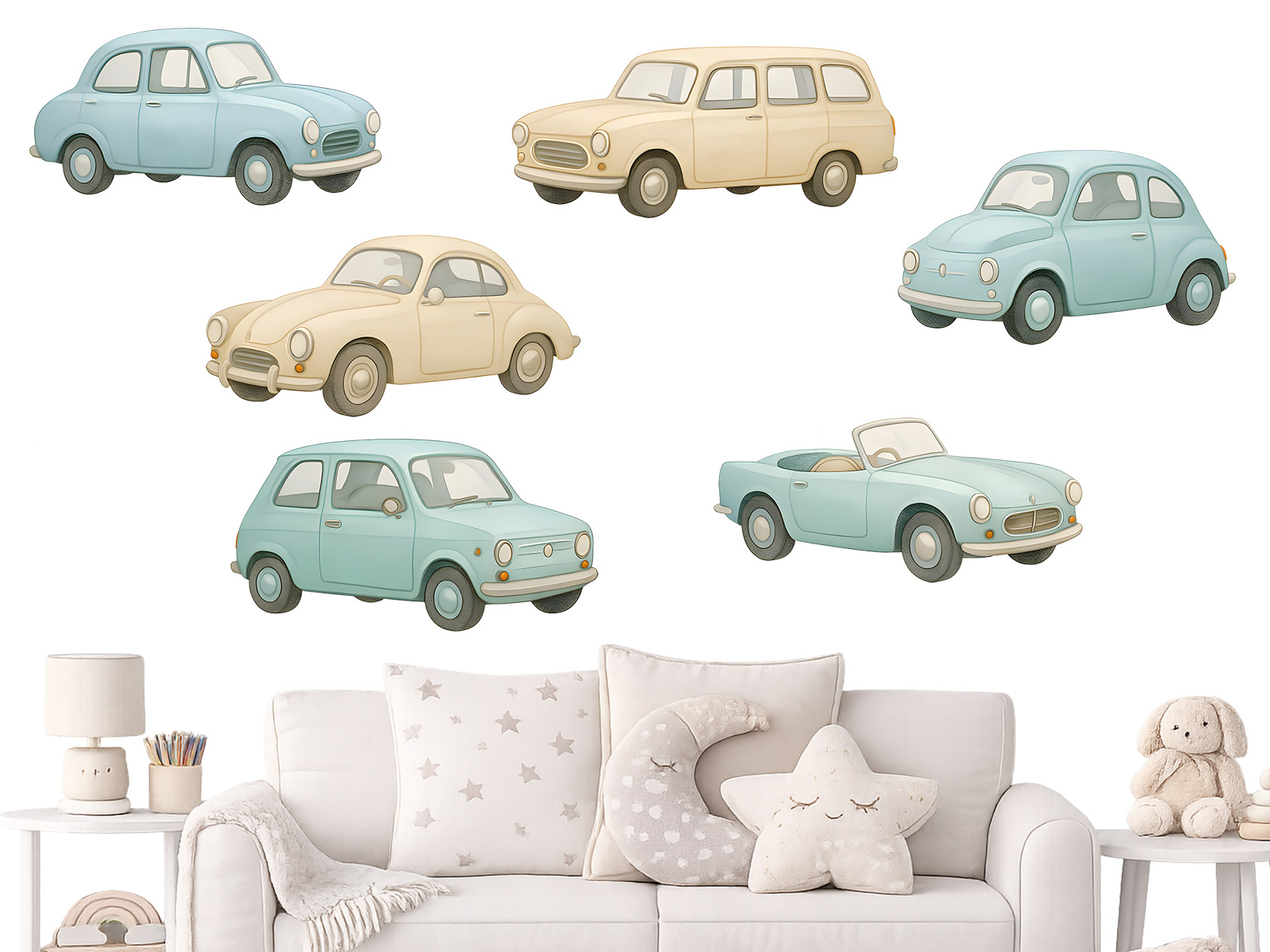 Roztomilá sada nástěnných samolepek na zeď s autíčky v jemných pastelových barvách je krásnou dekorací do dětského pokoje, která působí klidně, hravě a nadčasově. Jednotlivé motivy lze libovolně rozmístit a vytvořit tak vlastní malý svět plný autíček, který se snadno přizpůsobí velikosti i uspořádání místnosti. Samolepky se skvěle hodí nad postýlku, ke hracímu koutku nebo k dětskému stolečku a pomáhají dotvořit útulnou atmosféru, ve které se děti cítí příjemně a bezpečně. Jemné barvy a jednoduché tvary podporují fantazii a přirozeně ladí s ostatními doplňky v dětském interiéru.