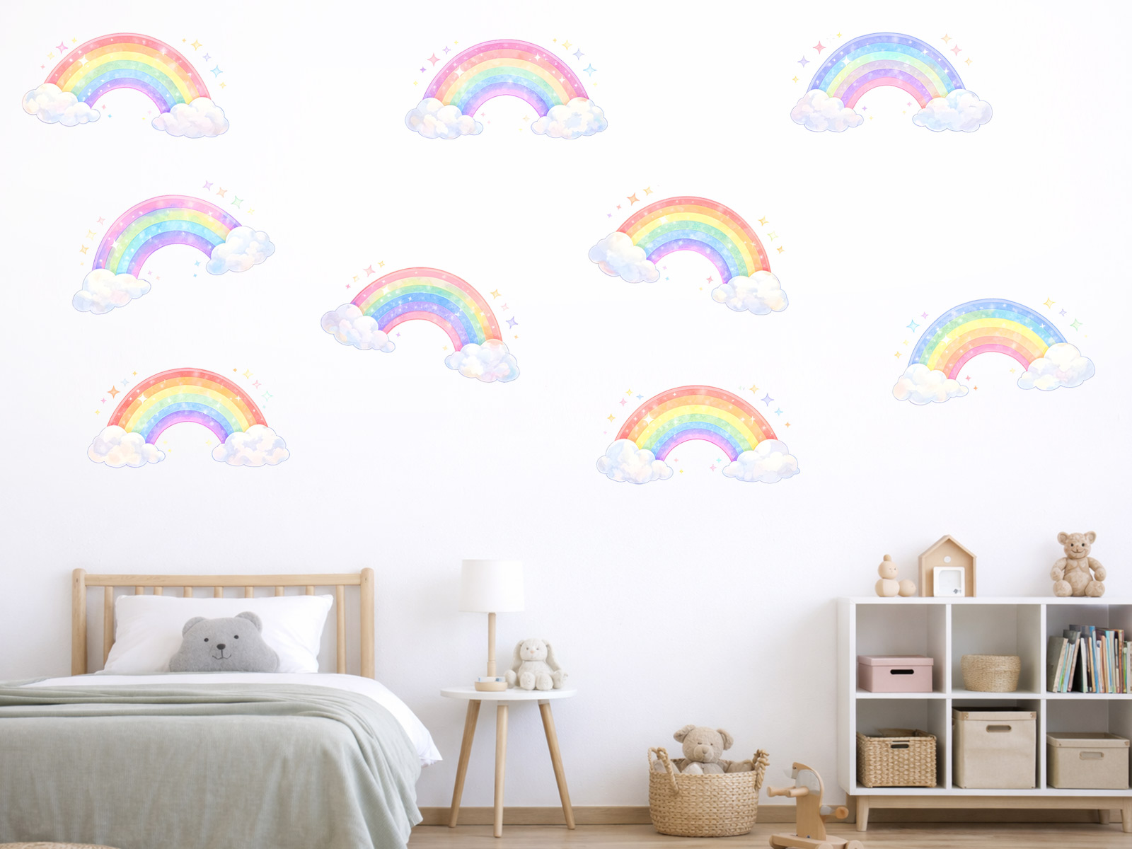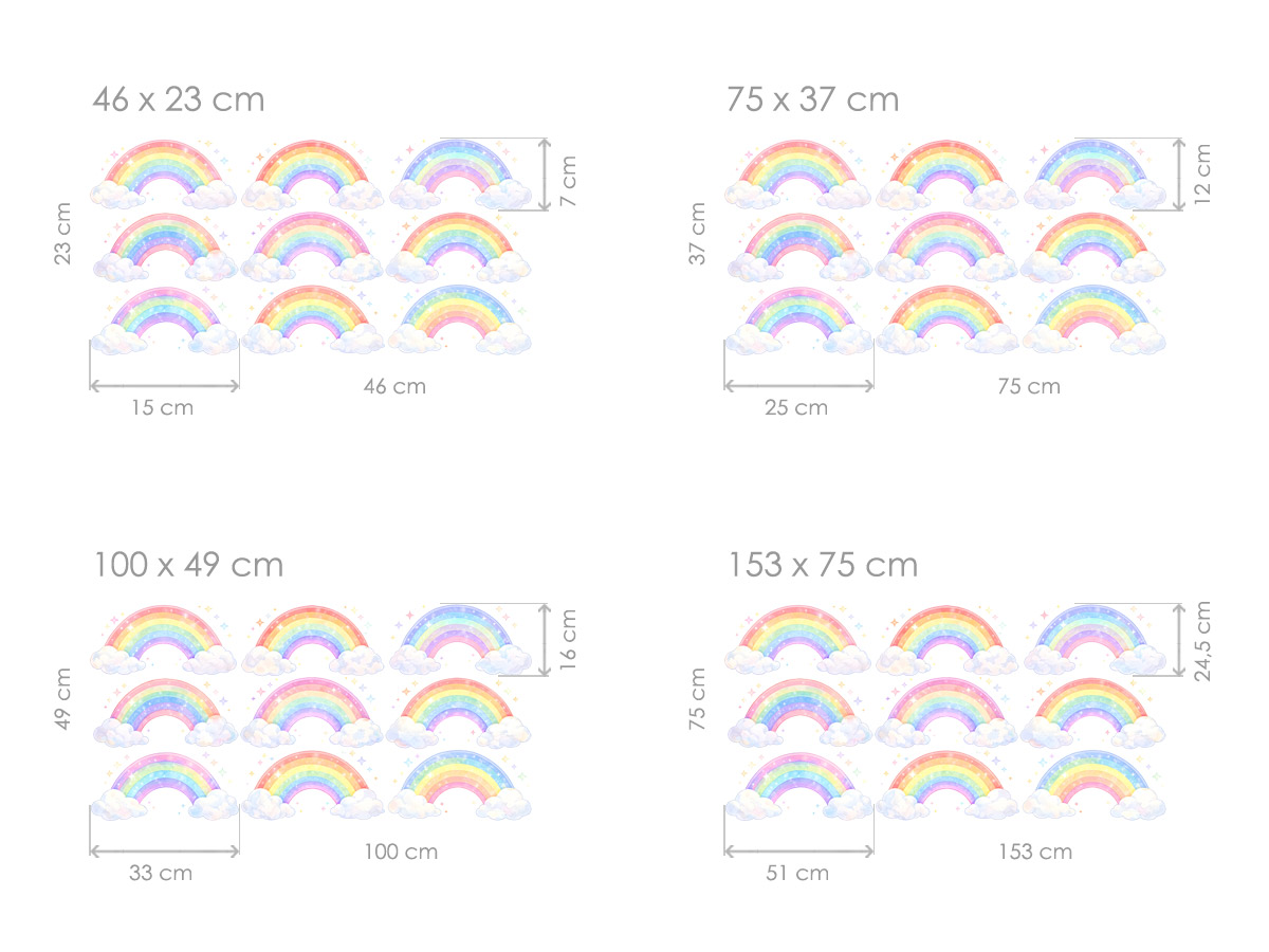 Samolepka na zeď „Barevné duhy“ přináší do dětského pokoje jemnou hravost, radost a kouzelnou atmosféru plnou pastelových barev. Sada obsahuje několik roztomilých duhových motivů s nadýchanými obláčky a drobnými hvězdičkami, které lze na zdi rozmístit podle vlastní fantazie – vytvořit lehký vzor nad postýlkou, pohádkovou oblohu nebo veselý akcent v celém pokoji. Měkké barevné přechody a akvarelový styl působí klidně a harmonicky, takže jsou ideální pro miminka i větší děti. Dužné odstíny růžové, modré, žluté a zelené krásně doplní světlý interiér a dodají prostoru pocit pohody, bezpečí a snové dětské fantazie.