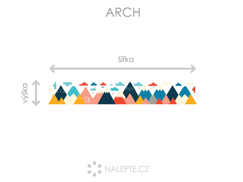 Arch = takto vám budou samolepky doručeny. Z archu jednotlivé části odlepíte a nalepíte na zeď tak, aby složily výsledný motiv dle Vašich představ. Arch si můžete prohlédnout ve fotogalerii. Rozměr archu volíte v objednávce. Přehled rozměrů (šířka x výška): a) arch 100 x 15 cm b) arch 130 x 20 cm c) arch 293 x 45 cm Šíře celého pohoří odpovídá šířce archu.