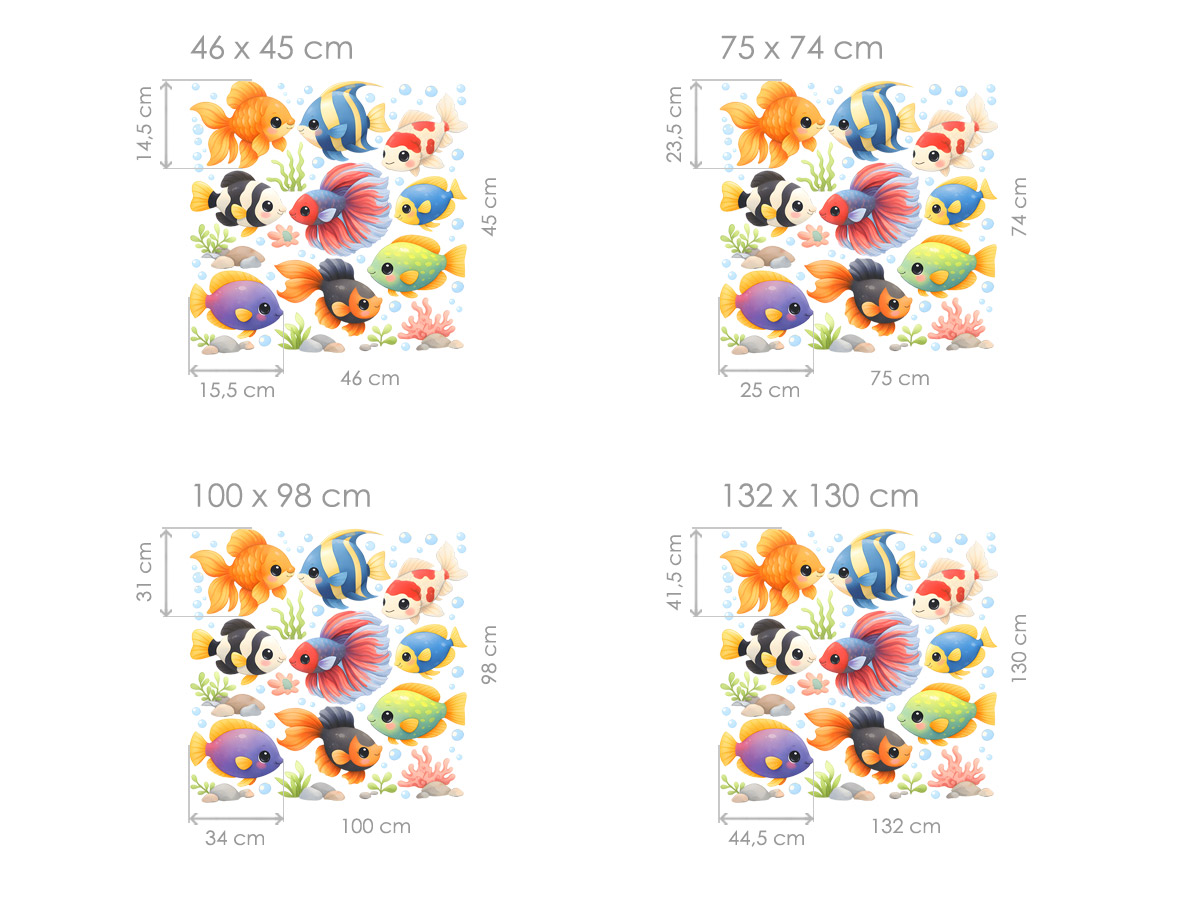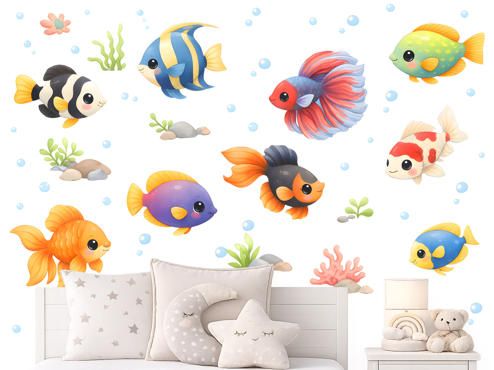 Samolepky na zeď roztomilé barevné rybičky přinášejí do dětského pokojíčku klidnou a radostnou atmosféru plnou fantazie a jemných barev. Hravé podmořské motivy s usměvavými rybkami, bublinkami a drobnými rostlinkami vytvářejí kouzelný svět, ve kterém se děti mohou každý den znovu a znovu ponořit do snění, objevování i tichého odpočinku. Celá kompozice působí něžně, přátelsky a harmonicky, takže prostor kolem postýlky nebo hracího koutku promění v bezpečné a útulné místo, kde se dětská představivost může volně rozvíjet a kde vznikají ty nejkrásnější vzpomínky na dětství.