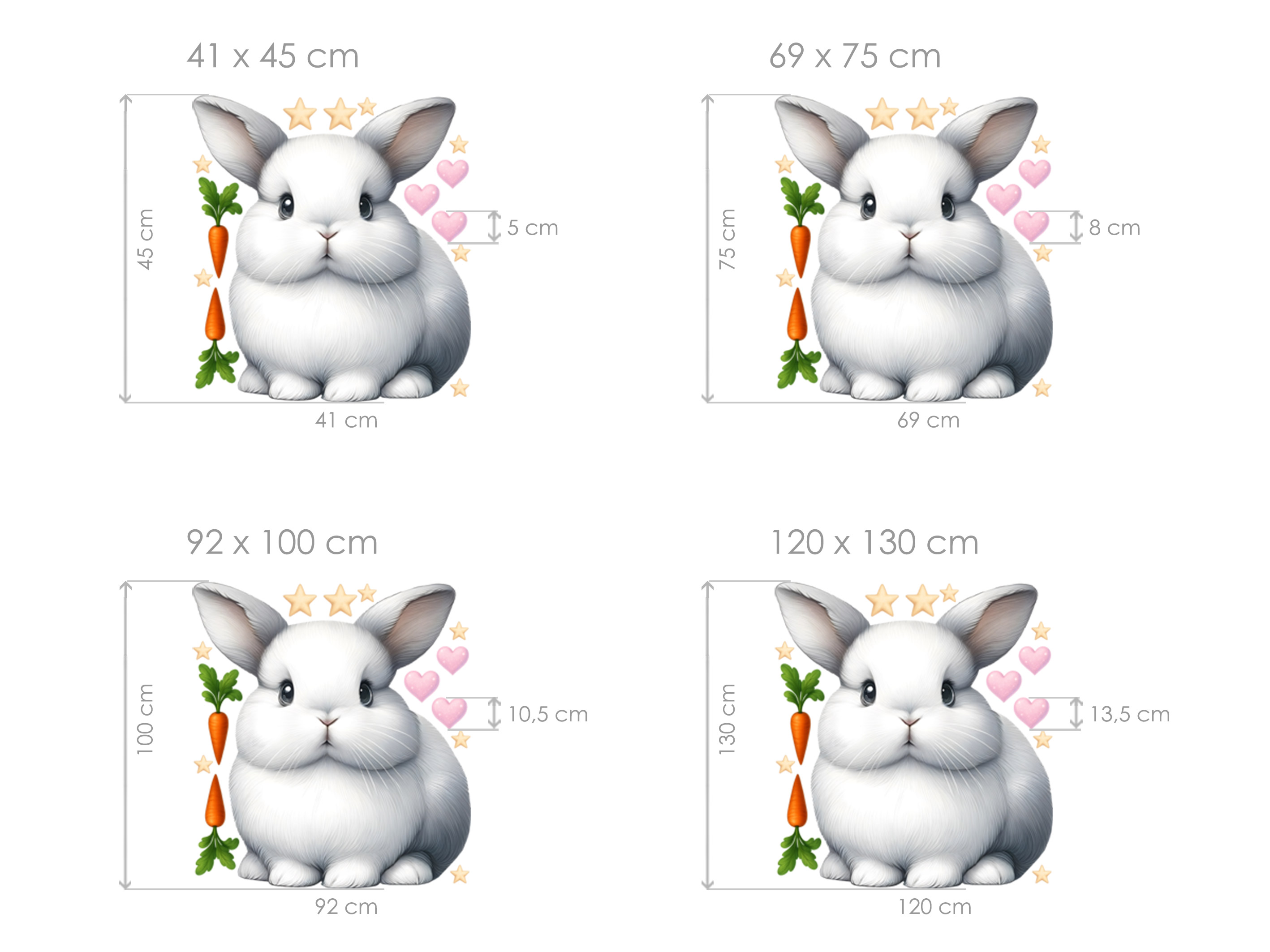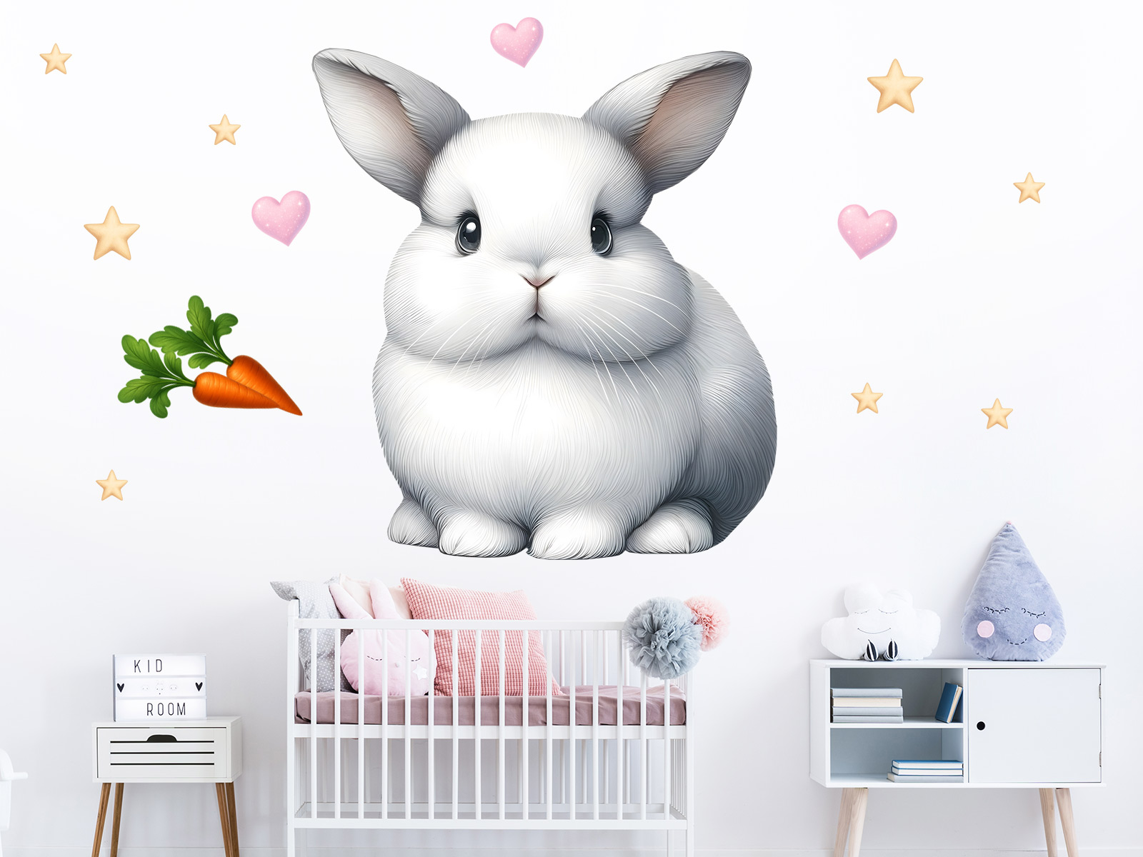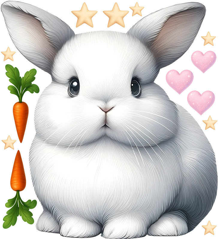 Samolepka na zeď „Bílý králík“ přináší do dětského pokoje něžnou, pohádkovou atmosféru, kterou si zamilují malí i velcí. Dominantou celé sady je jemně propracovaný bílý králíček s heboučkou srstí a velkýma hloubavýma očima, který působí neuvěřitelně roztomile a hřejivě. Součástí archu jsou také doplňkové motivy – hvězdičky, srdíčka a samozřejmě oblíbené mrkvičky, díky kterým si lze vytvořit libovolné rozmístění na stěně či nábytku. Celá ilustrace je vyvedena v luxusním, detailním stylu s jemnými texturami, které dodávají motivům realistický, ale stále pohádkový vzhled. „Bílý králík“ je ideální volbou pro výzdobu dětského koutku, ložnice nebo herny – vytvoří kouzelné prostředí plné něhy, klidu a hravosti.