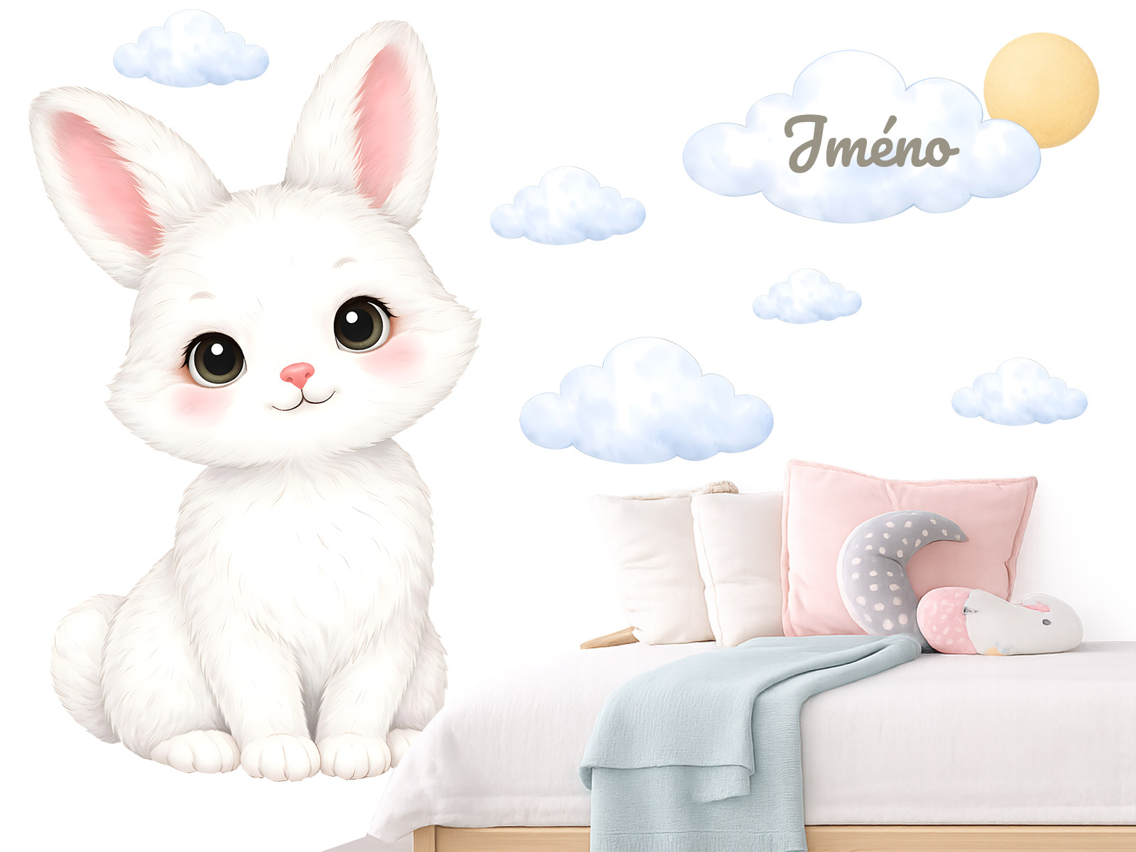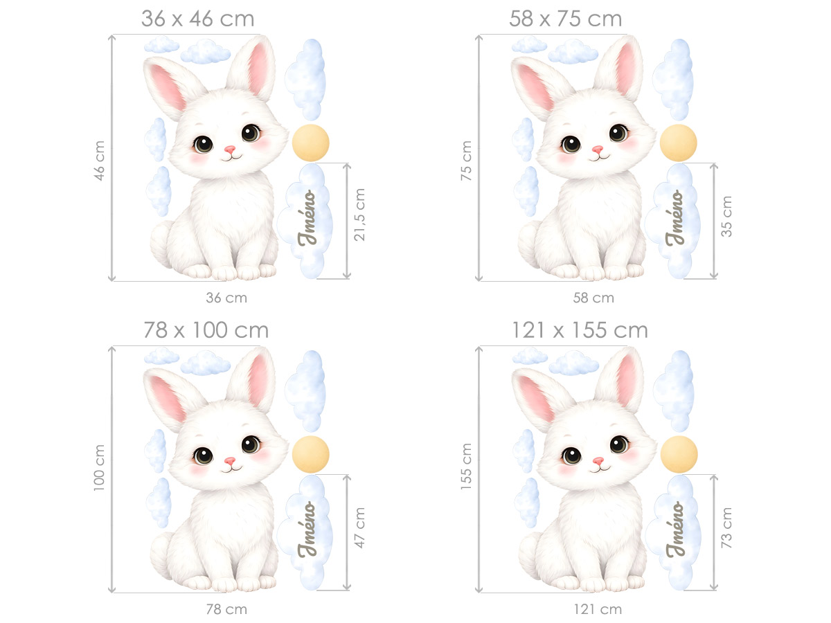 Jméno na přání na mráčku lze samotné nebo kombinovat s datem narození nebo například věkem (tento údaj bude vycentrován pod jménem ve druhém řádku). Lze vyrobit i beze jména. Text zadejte ve 3. kroku objednávky do pole "poznámka". Máte-li speciální přání kontaktujte nás: info@nalepte.cz. Samolepky na zeď Bílý zajíček se jménem jsou jemnou a velmi roztomilou dekorací, která vnese do dětského pokojíčku klidnou a něžnou atmosféru. Hebký bílý zajíček s velkýma očima a růžovými detaily působí čistě, laskavě a uklidňujícím dojmem. Motiv doplňují lehké obláčky a sluníčko v pastelových tónech, které společně vytvářejí harmonickou a vzdušnou kompozici. Prostor pro jméno na obláčku dává dekoraci osobní charakter a dělá z ní krásný a jedinečný prvek na míru. Díky světlým barvám se samolepka skvěle hodí do miminkovského i dětského pokojíčku, a to jak pro holčičky, tak i pro neutrální interiéry. Ideální umístění je nad postýlku, postel nebo přebalovací pult, kde podtrhne pocit bezpečí a jemnosti.