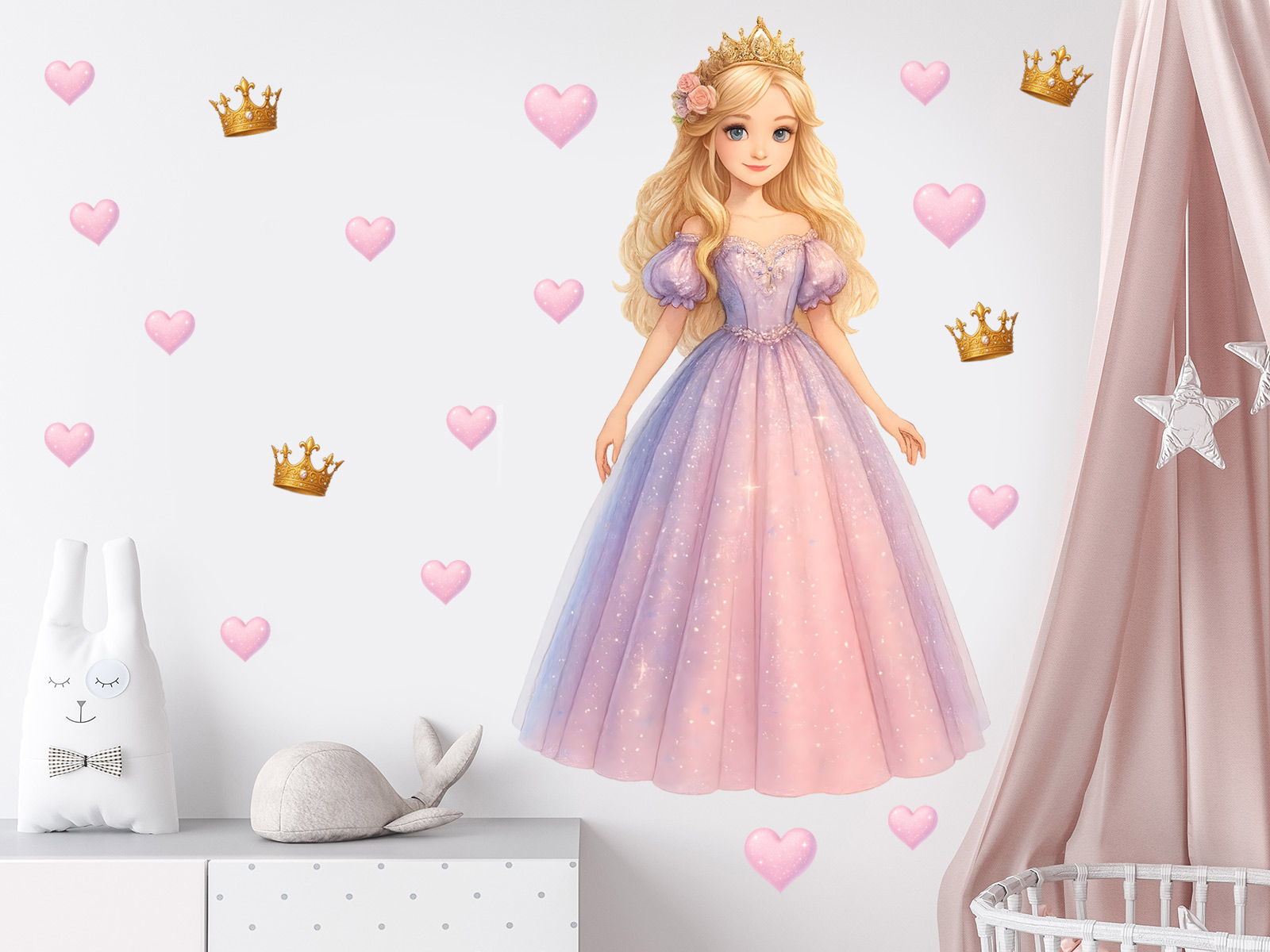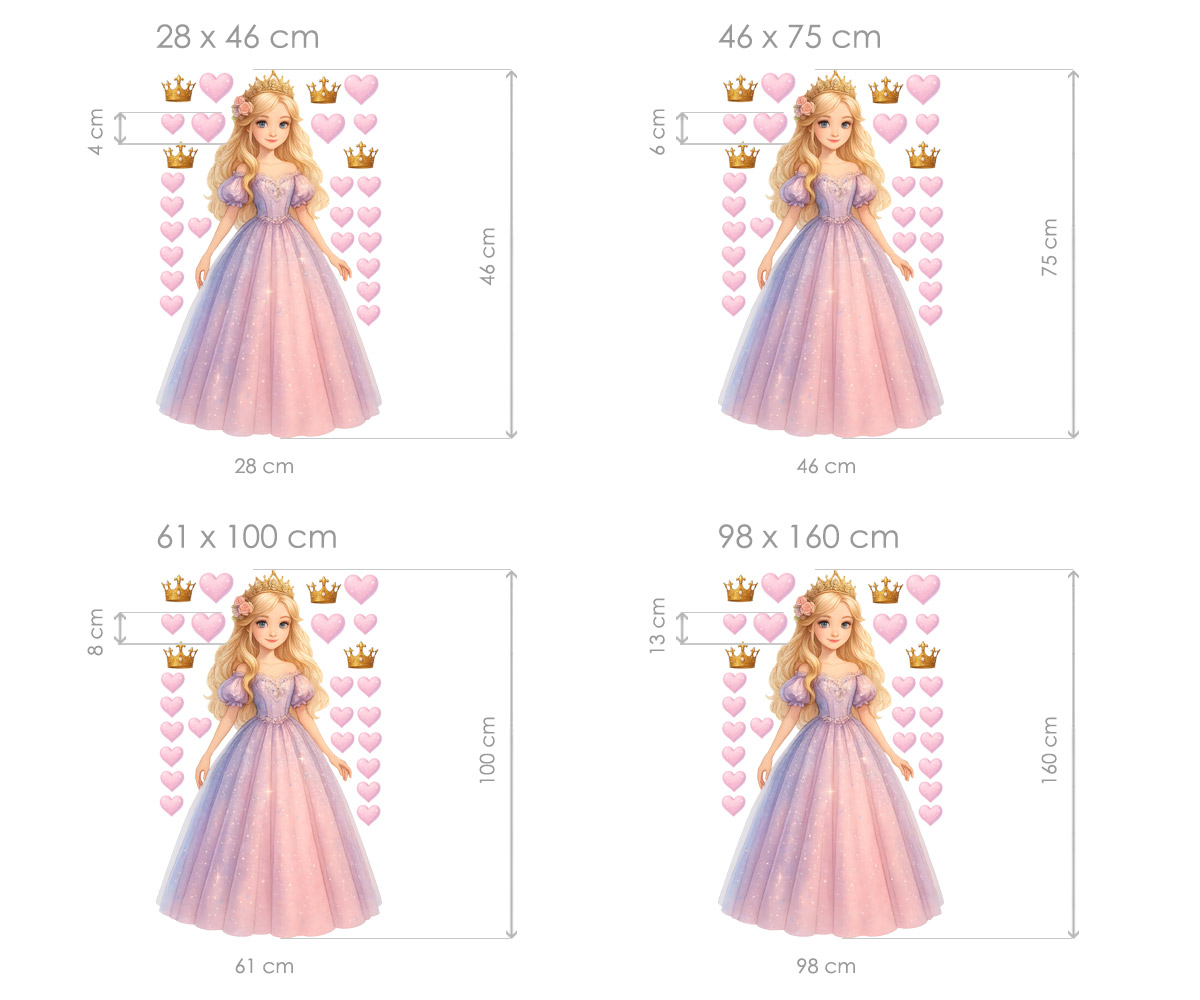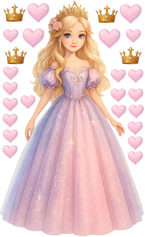 Proměňte pokojíček v kouzelný zámek s půvabnou sadou samolepek Princezna v růžových šatech. Jemná princezna s dlouhými blond vlasy, třpytivou róbou a zlatou korunkou přinese do dětského pokoje atmosféru elegance, laskavosti a pohádkového světa. Sadu doplňují růžová srdíčka a zlaté korunky, které můžete na zdi rozmístit podle vlastní fantazie – společně vytvoří dokonalou dekoraci plnou jemných barev a pohádkového lesku. Co sada obsahuje: - Hlavní motiv princezny ve velkém formátu - Růžová srdíčka různých velikostí - Zlaté korunky s jemným třpytem