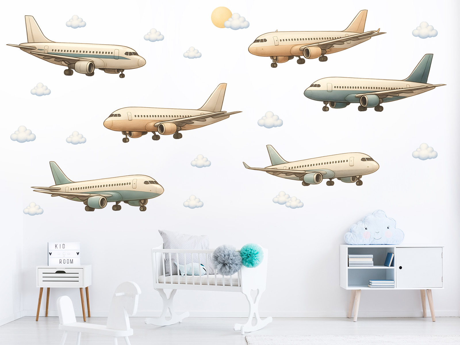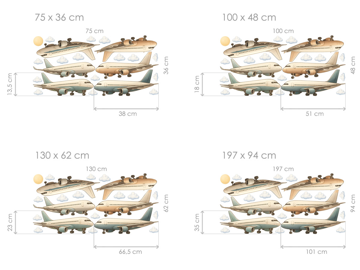 Samolepka na zeď „Boeingy a Airbusy“ přináší do dětského pokoje atmosféru skutečného letiště – elegantní dopravní letadla v různých barvách a úhlech letu vytvářejí dynamickou a hravou scénu, která potěší všechny malé milovníky letectví. Sada obsahuje několik typů moderních dopravních letadel, odlehčených měkkými pastelovými odstíny a doplněných nadýchanými mráčky a sluníčkem, takže celek působí příjemně, jemně a harmonicky. Letadla lze na stěnu rozmístit volně podle vlastní fantazie – vysoko nad postel, nad hrací koutek nebo po celé délce stěny, aby vznikl dojem rušného nebe plného pohybu. Tento motiv snadno promění každý pokoj v kreativní a inspirativní prostor, kde se děti mohou vydávat na myslivá dobrodružství a představovat si vlastní letecké cesty po celém světě.