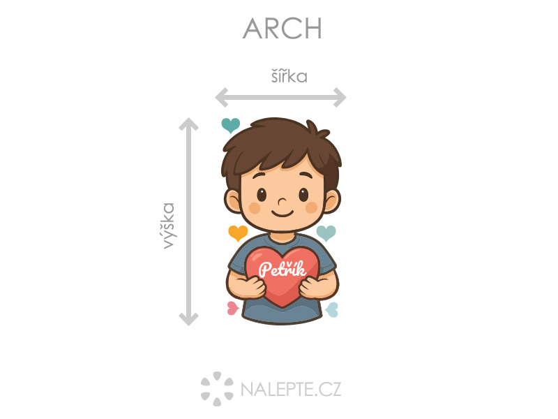Jméno na přání v srdíčku lze samotné nebo kombinovat s datem narození nebo například věkem (tento údaj bude vycentrován pod jménem ve druhém řádku). Text zadejte ve 3. kroku objednávky do pole "poznámka". Máte-li speciální přání kontaktujte nás: info@nalepte.cz. Bude Vám zaslán náhled ke schválení emailem. Arch = takto vám budou samolepky doručeny. Každý prvek na archu je samostatná samolepka, jednotlivé části jednoduše od papírového podkladu odlepíte a nalepíte na zeď tak, aby složily výsledný motiv dle Vašich představ. Arch si můžete prohlédnout ve fotogalerii. Rozměr archu volíte v objednávce. Přehled předdefinovaných rozměrů (šířka x výška): a) arch 27 x 46 cm b) arch 44 x 76 cm c) arch 58 x 100 cm c) arch 75 x 130 cm Je možné zvolit i libovolný vlastní rozměr archu pomocí posuvníku či klikání na "Větší", "Menší" Šířka chlapce odpovídá šířce archu, výška chlapce odpovídá výšce archu