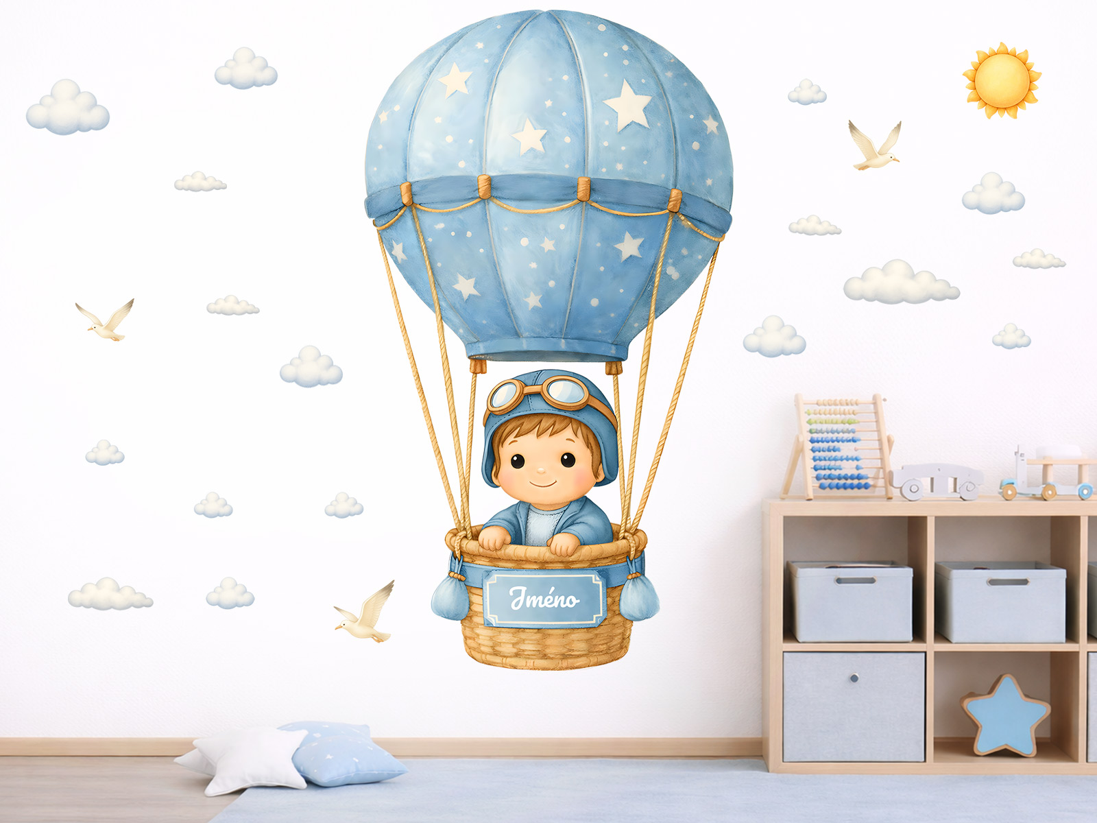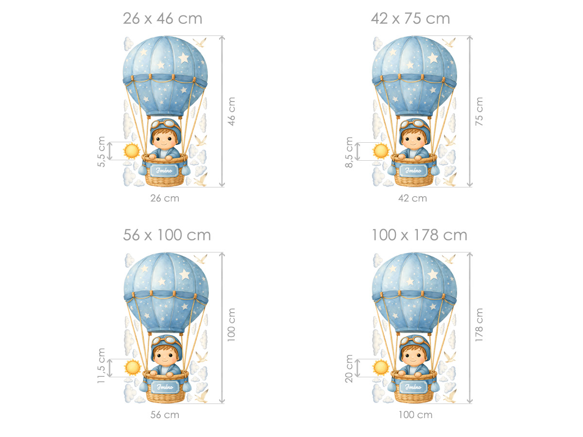 Jméno na přání na cedulce na koši létajícího horkovzdušného balónu lze s délkou do 12 znaků. Text zadejte ve 3. kroku objednávky do pole "poznámka". Máte-li speciální přání kontaktujte nás: info@nalepte.cz. Samolepka na zeď „Chlapec v balónu se jménem na přání“ přenese dětský pokoj do světa snů, oblaků a dobrodružných výprav vysoko nad zemí. Roztomilý chlapec v pilotní čepici letí v horkovzdušném balónu zdobeném hvězdičkami, obklopený jemnými obláčky a ptáčky, což vytváří klidnou, pohádkovou atmosféru ideální pro dětský interiér. Díky možnosti doplnění vlastního jména na košík balónu se z dekorace stává osobní prvek, který potěší děti i rodiče a krásně podtrhne jedinečnost pokoje. Ilustrace v měkkých pastelových barvách působí něžně, hravě a nadčasově a snadno se sladí s ostatním vybavením dětského pokoje, kde vytvoří útulné a snové prostředí plné fantazie.