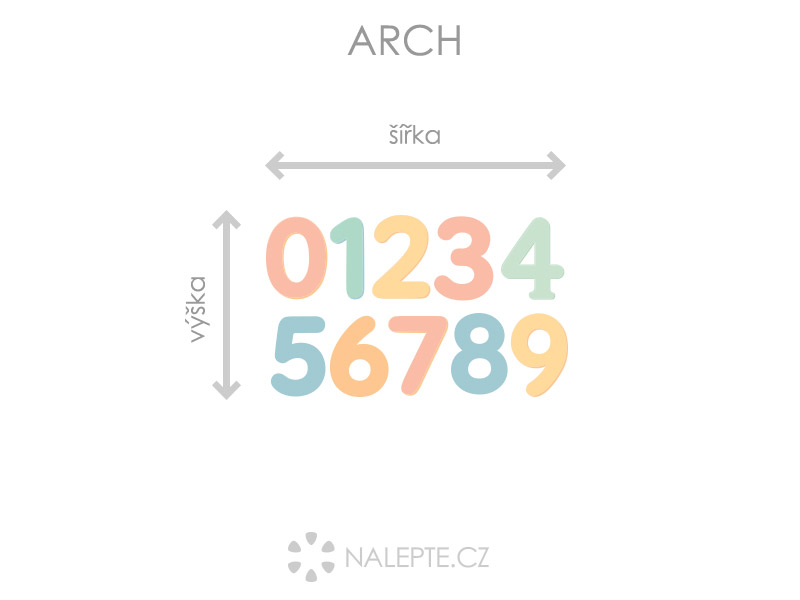 Arch = takto vám bude samolepka doručena. Každý prvek na archu je samostatná samolepka, jednotlivé části jednoduše od papírového podkladu odlepíte a nalepíte na zeď tak, aby složily výsledný motiv dle Vašich představ. Arch si můžete prohlédnout ve fotogalerii. Rozměr archu volíte v objednávce. Přehled předdefinovaných rozměrů (šířka x výška): a) arch 46 x 28 cm b) arch 75 x 45 cm c) arch 100 x 61 cm d) arch 165 x 100 cm Je možné zvolit i libovolný vlastní rozměr archu pomocí posuvníku či klikání na "Větší", "Menší" Výška číslice odpovídá jedné polovině výšky archu.