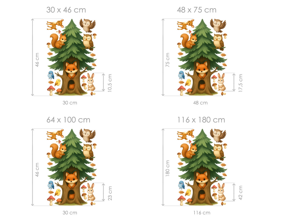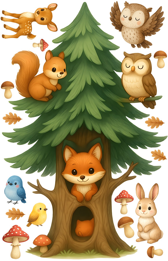 Samolepky na zeď „Dětský barevný strom“ přinese do pokoje vašich dětí kouzelnou atmosféru lesa plnou pohody a přátelství. Vysoký zelený strom se stává domovem pro roztomilou lišku, sovičku a veverku, zatímco kolem poletuje listí a rostou houbičky. Jemné barvy, přátelské výrazy zvířátek a detailní ilustrace vytvářejí harmonický a hřejivý celek, který krásně zapadne do každého dětského pokoje. Díky snadné aplikaci lze motivy libovolně rozmístit podle vlastních představ – nad postýlku, do hracího koutku nebo po celé stěně. Tento set dodá interiéru hravý, přívětivý nádech a pomůže vytvořit místo, kde se děti budou cítit spokojeně a v bezpečí.