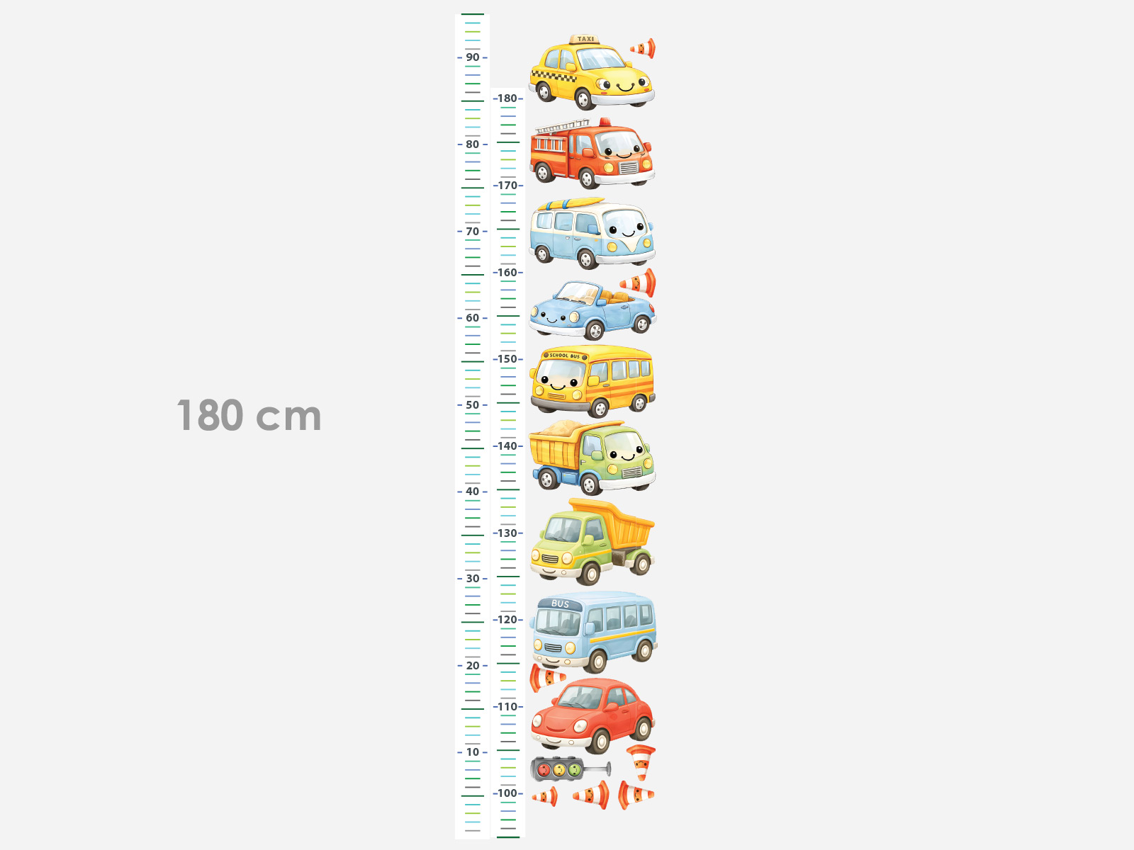 Připravili jsme pro vás dětský metr s s autíčky pro děti, u kterého si můžete zvolit výšku od 160 do 180 cm. Prosíme vybírejte jen z předvolených rozměrů, nepoužívejte funkci vlastní rozměr. Bez ohledu na volbu velikosti všechna autíčka jsou vždy součástí dodaného archu. Šířka jednoho autčíka je cca 14 cm. Výhodou metru je, že lepíte od země až do výšky 180 cm. Pruh s metrem je vždy dodáván v polovině rozříznutý tedy na dva kusy, nejprve tedy nalepíte spodní část, poté navážete horní částí. Každé autíčko je samostatnou samolepkou. Textilní materiál lze popsat tužkou, propiskou či tenkým fixem, abyste mohli zaznamenat progres růstu vašich dětí. Samolepka na zeď Dětský metr autíčka je veselou a hravou dekorací, která potěší každého malého milovníka dopravních prostředků. Růstový metr uprostřed doplňuje pestrá kolekce autíček – od osobních vozů přes autobus a taxi až po hasičské auto. Motiv je oživený dopravními kužely a semaforem, které dodávají celé kompozici zábavný „silniční“ charakter. Jemné pastelové barvy a roztomilé výrazy autíček působí přátelsky a ideálně zapadnou do dětského pokojíčku. Metr umožňuje snadno sledovat, jak dítě roste, a promění každé měření v radostný moment. Díky samostatným prvkům si navíc můžete autíčka rozmístit přesně podle svého prostoru. Perfektní doplněk nad postel nebo do hracího koutku pro malé řidiče.