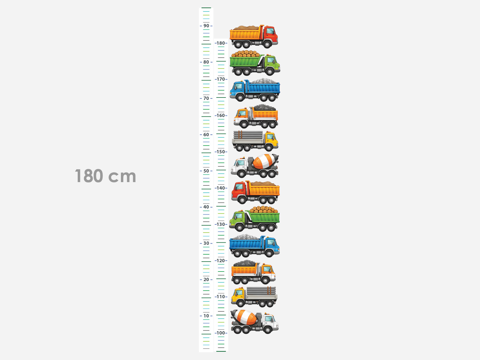 Připravili jsme pro vás dětský metr s s náklaďáky pro děti, u kterého si můžete zvolit výšku od 160 do 180 cm. Prosíme vybírejte jen z předvolených rozměrů, nepoužívejte funkci vlastní rozměr. Bez ohledu na volbu velikosti všechny náklaďáky jsou vždy součástí dodaného archu. Šířka jednoho Náklaďáku je cca 14 cm. Výhodou metru je, že lepíte od země až do výšky 180 cm. Pruh s metrem je vždy dodáván v polovině rozříznutý tedy na dva kusy, nejprve tedy nalepíte spodní část, poté navážete horní částí. Každý náklaďák je samostatnou samolepkou. Textilní materiál lze popsat tužkou, propiskou či tenkým fixem, abyste mohli zaznamenat progres růstu vašich dětí. Samolepka na zeď Dětský metr s náklaďáky je skvělou kombinací hravé dekorace a praktického pomocníka pro sledování růstu dítěte. Dominantní růstový metr je doplněný o pestrou sbírku nákladních aut s různými náklady – dřevo, štěrk, písek nebo trubky. Realističtější styl vozidel působí atraktivně zejména pro malé nadšence do aut a techniky. Barevná různorodost jednotlivých náklaďáků dodává celé kompozici dynamiku a oživí každou stěnu. Díky rozložení prvků kolem metru si můžete vytvořit vlastní uspořádání přesně podle prostoru. Metr pak slouží nejen k měření, ale i jako krásná vzpomínka na dětská léta. Ideální doplněk do pokojíčku malých řidičů a milovníků velkých aut.