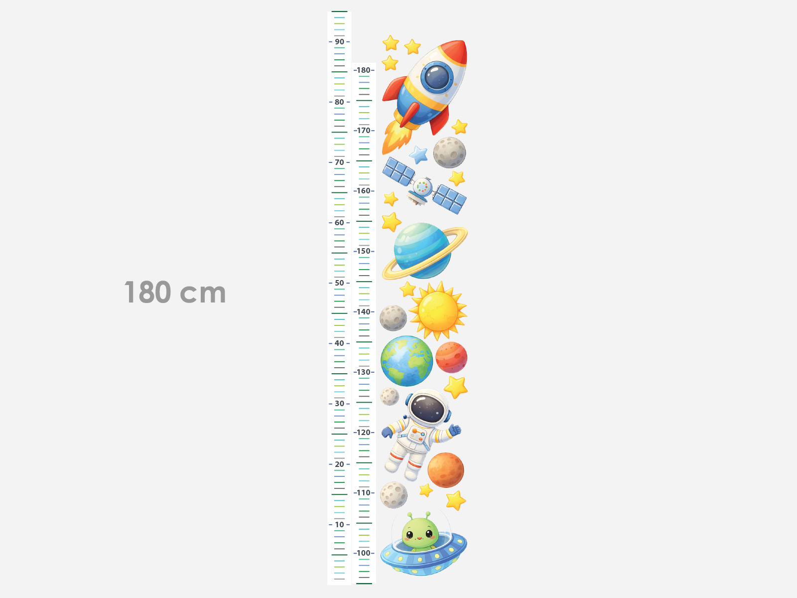 Připravili jsme pro vás dětský metr s motivem vesmíru, u kterého si můžete zvolit výšku od 160 do 180 cm. Prosíme vybírejte jen z předvolených rozměrů, nepoužívejte funkci vlastní rozměr. Bez ohledu na volbu velikosti jsou všechny vesmírné prvky vždy součástí dodaného archu. Výhodou metru je, že lepíte od země až do výšky 180 cm. Pruh s metrem je vždy dodáván v polovině rozříznutý tedy na dva kusy, nejprve tedy nalepíte spodní část, poté navážete horní částí. Každý vesmírný prvek např. kosmonaut, planety, ufon jsou vždy samostatnou samolepkou. Textilní materiál lze popsat tužkou, propiskou či tenkým fixem, abyste mohli zaznamenat progres růstu vašich dětí. Samolepka na zeď Dětský metr vesmír přenese děti do světa fantazie a dobrodružství mezi hvězdy. Růstový metr je obklopený veselými vesmírnými motivy – raketou, astronautem, planetami, hvězdami i roztomilým mimozemšťanem. Barevné a hravé ilustrace vytvářejí dynamickou scénu plnou objevování a inspirují dětskou představivost. Kombinace modré, žluté a oranžové působí svěže a zároveň příjemně, takže motiv krásně vynikne na světlé stěně. Metr umožňuje sledovat růst dítěte a promění každé měření v malé vesmírné dobrodružství. Díky jednotlivým prvkům si navíc můžete vytvořit vlastní rozložení přesně podle prostoru. Ideální dekorace do pokojíčku malých astronautů a objevitelů.