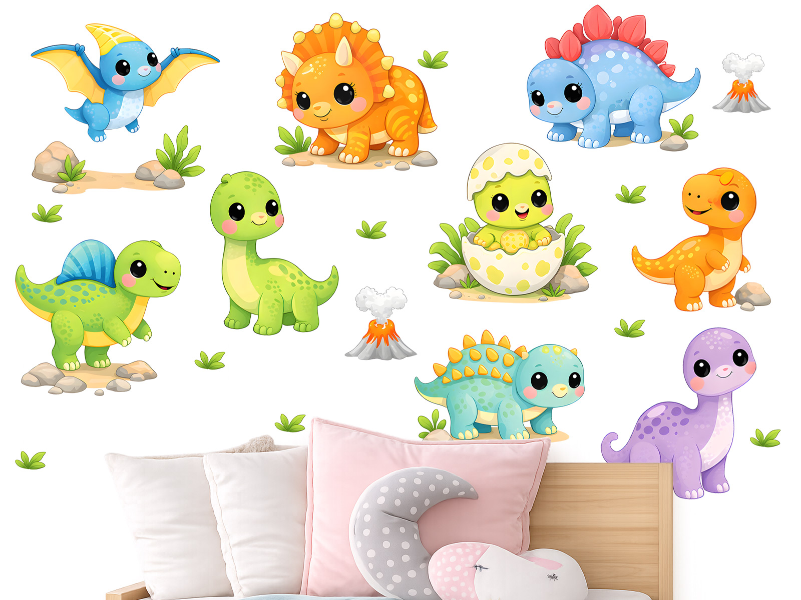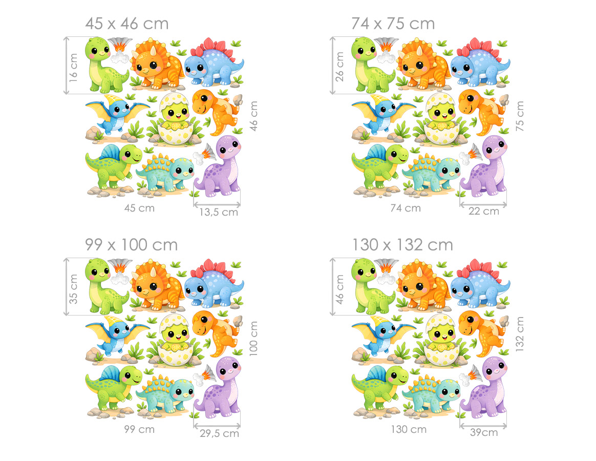 Samolepky na zeď Dino dinosauři přenesou děti do veselého světa prehistorických dobrodružství. Roztomilé ilustrace malých dinosaurů v pestrých barvách vytvářejí hravou scénu, která okamžitě oživí dětský pokoj a podnítí dětskou fantazii. Motiv obsahuje několik druhů dinosaurů – například triceratopse, brachiosaura, stegosaury nebo malého pterodaktyla. Nechybí ani právě vylíhlé dinosauří mládě ve vajíčku. Celou scénu doplňují drobné detaily, jako jsou kamínky, rostliny nebo malé sopky, které dodávají dekoraci dobrodružnou atmosféru dávných časů. Barevní dinosauři působí mile a přátelsky, takže jsou ideální dekorací do dětského pokoje, herního koutku nebo pokoje pro malé milovníky dinosaurů. Rozmístěním jednotlivých motivů si můžete vytvořit vlastní dinosauří krajinu plnou fantazie a veselých příběhů.