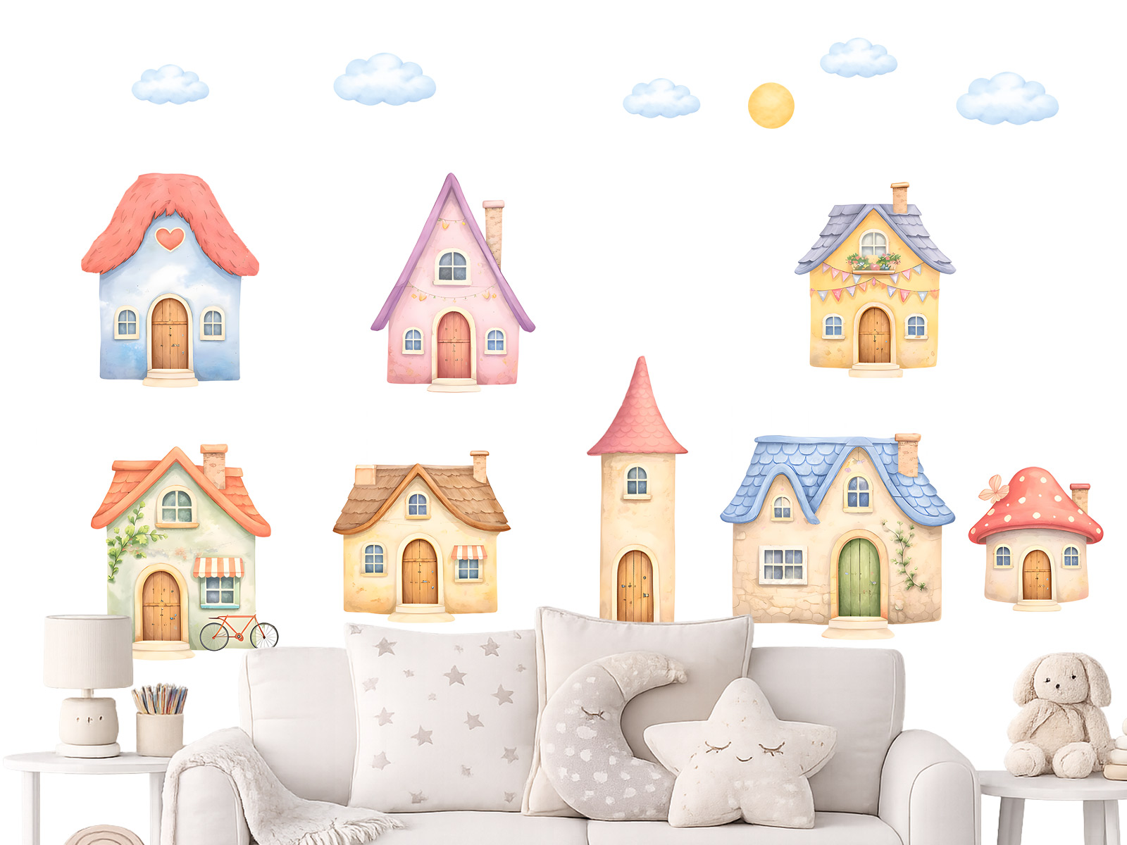 Samolepky na zeď Domky domečky promění dětský pokoj v kouzelnou pohádkovou vesničku plnou fantazie. Roztomilé barevné domečky s různými tvary střech, okýnek a dveří vytvářejí hravou a veselou kompozici, která podporuje dětskou představivost. Jemné akvarelové zpracování v pastelových tónech dodává motivu něžnost a klidnou atmosféru. Každý domeček je originální a doplněný drobnými detaily, jako jsou girlandy, květiny nebo malé dekorace, které celek krásně oživují. Samolepka je ideální do dětského pokoje nad postel, hrací koutek nebo na volnou stěnu, kde vytvoří útulné a inspirativní prostředí. Díky svému rozvržení lze jednotlivé prvky rozmístit podle vlastní fantazie. Perfektní volba pro vytvoření pohádkového světa, ve kterém se děti budou cítit bezpečně, hravě a spokojeně.