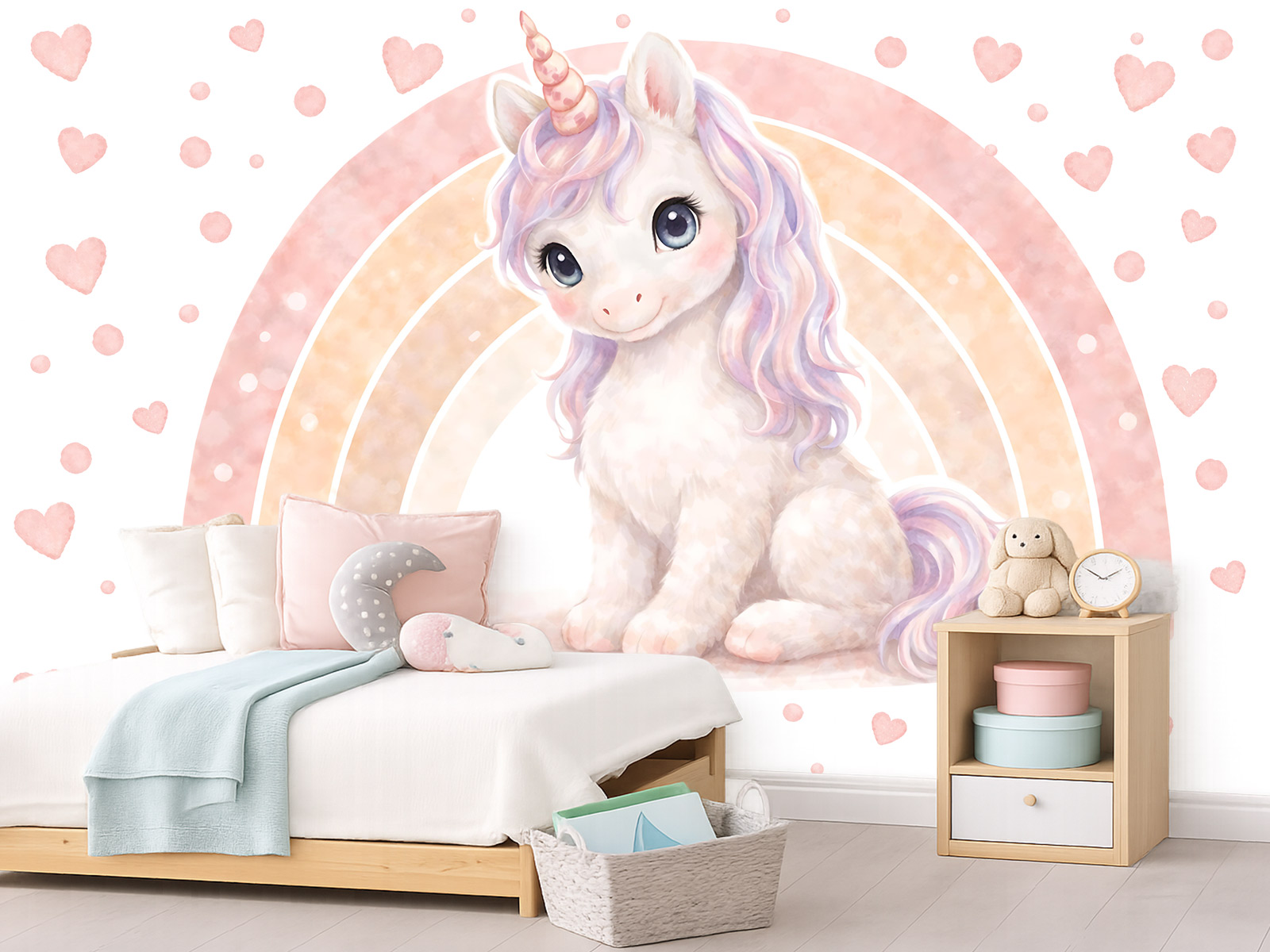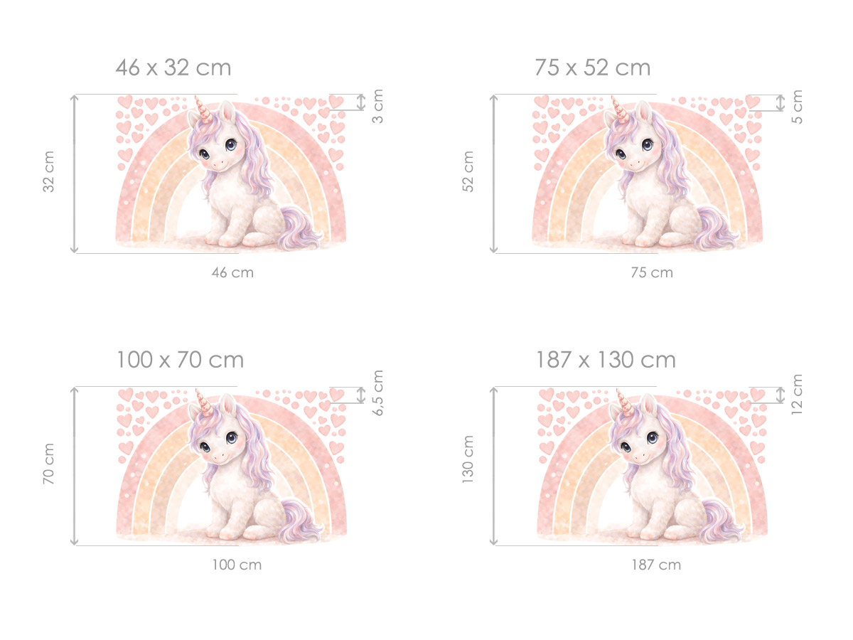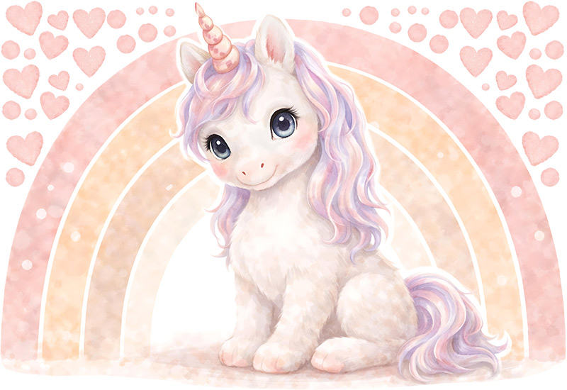 Duha a jednorožec je kouzelná samolepka na zeď, která vnese do dětského pokoje pohádkovou atmosféru plnou něhy, fantazie a jemných barev. Roztomilý jednorožec s velkýma očima a pastelovou hřívou sedící pod jemnou duhou obklopenou drobnými srdíčky působí klidně, hřejivě a snově – ideální pro vytvoření útulného a bezpečného prostoru pro děti. Ilustrace v akvarelovém stylu s harmonickou kombinací růžových, broskvových a krémových tónů krásně ladí s dětským nábytkem a doplňky a snadno se stane dominantou pokoje. Arch obsahuje hlavní motiv jednorožce s duhou i doplňkové prvky, které umožňují vytvořit vyváženou a hravou kompozici přesně podle velikosti a stylu místnosti. Samolepka je navržena tak, aby působila jemně, elegantně a nadčasově a byla ideální volbou pro malé milovníky pohádek, fantazie a kouzelných světů.