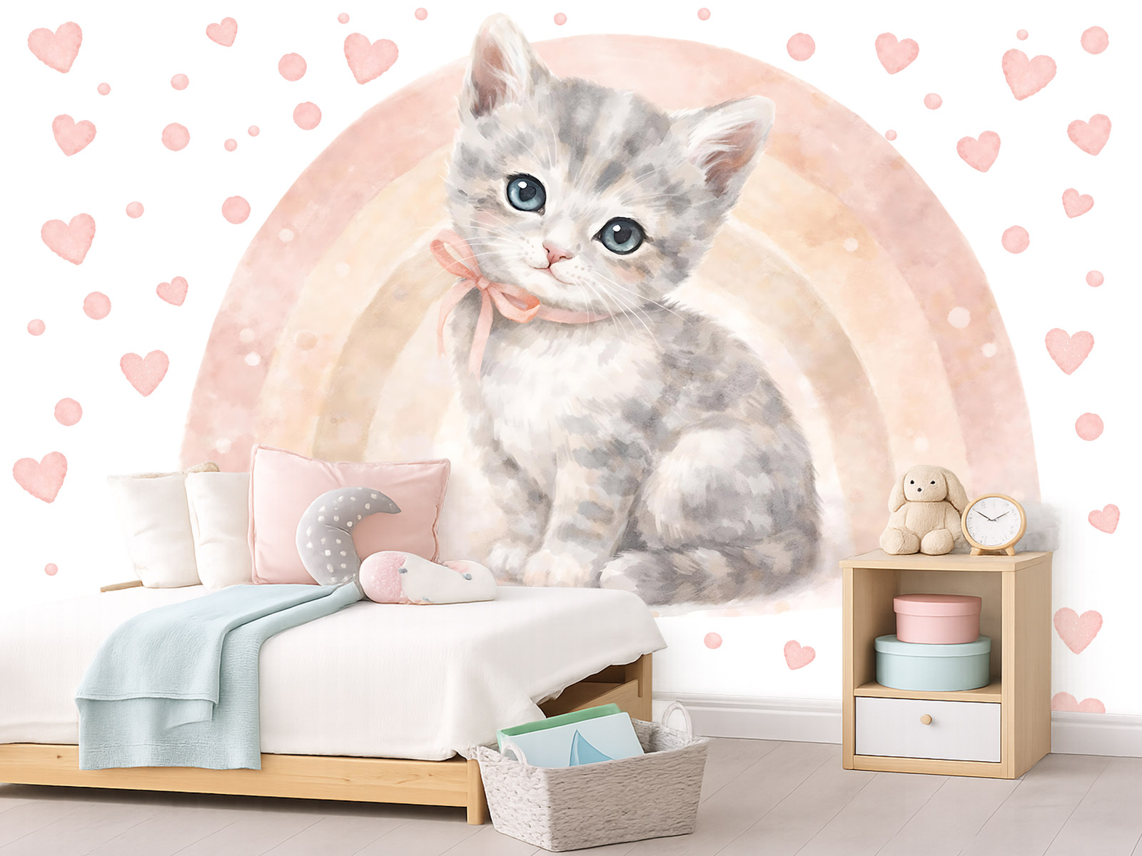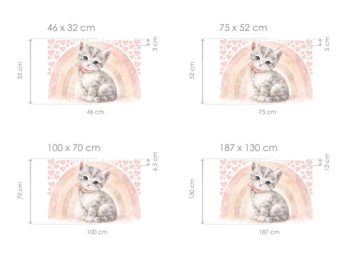 Samolepka na zeď „Duha a kočka“ přináší do dětského pokoje jemnou pohodu, něhu a kouzelnou atmosféru. Roztomilé kotě s velkýma očima sedící pod pastelovou duhou, doplněné drobnými srdíčky, působí klidně, laskavě a velmi hřejivě – ideální motiv pro miminka i větší děti. Akvarelový styl s měkkými přechody barev krásně ladí s moderním i klasickým dětským interiérem a vytváří pocit bezpečí a útulnosti. Samolepka se hodí nad postýlku, postel nebo do hracího koutku a díky různým velikostem v archu si snadno zvolíte variantu, která nejlépe zapadne do vašeho prostoru. Motiv kočičky s duhou se stane něžnou dominantou pokoje a potěší všechny malé milovníky zvířátek a pohádkových ilustrací.