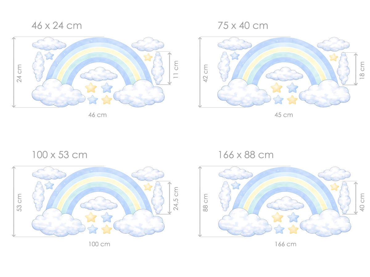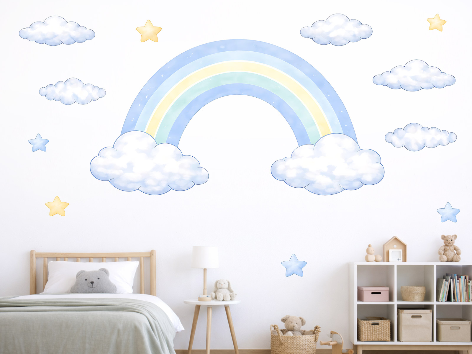 Samolepka na zeď „Duha pro kluky“ přináší do dětského pokoje klidnou, snovou atmosféru plnou jemných barev a hravých detailů. Dominantní pastelová duha v modrých a světlých tónech je doplněná nadýchanými mráčky a drobnými hvězdičkami, které společně vytvářejí harmonický a uklidňující motiv ideální pro klučičí pokoj, hernu i kout na spaní. Ilustrace působí lehce, vzdušně a přátelsky, krásně vynikne na světlé stěně a snadno se kombinuje s dalším dětským nábytkem a dekoracemi. Arch obsahuje jednotlivé prvky, díky kterým si můžete vytvořit vlastní kompozici přesně podle prostoru a fantazie dítěte, a proměnit tak pokoj v místo plné pohody, představivosti a sladkých snů.