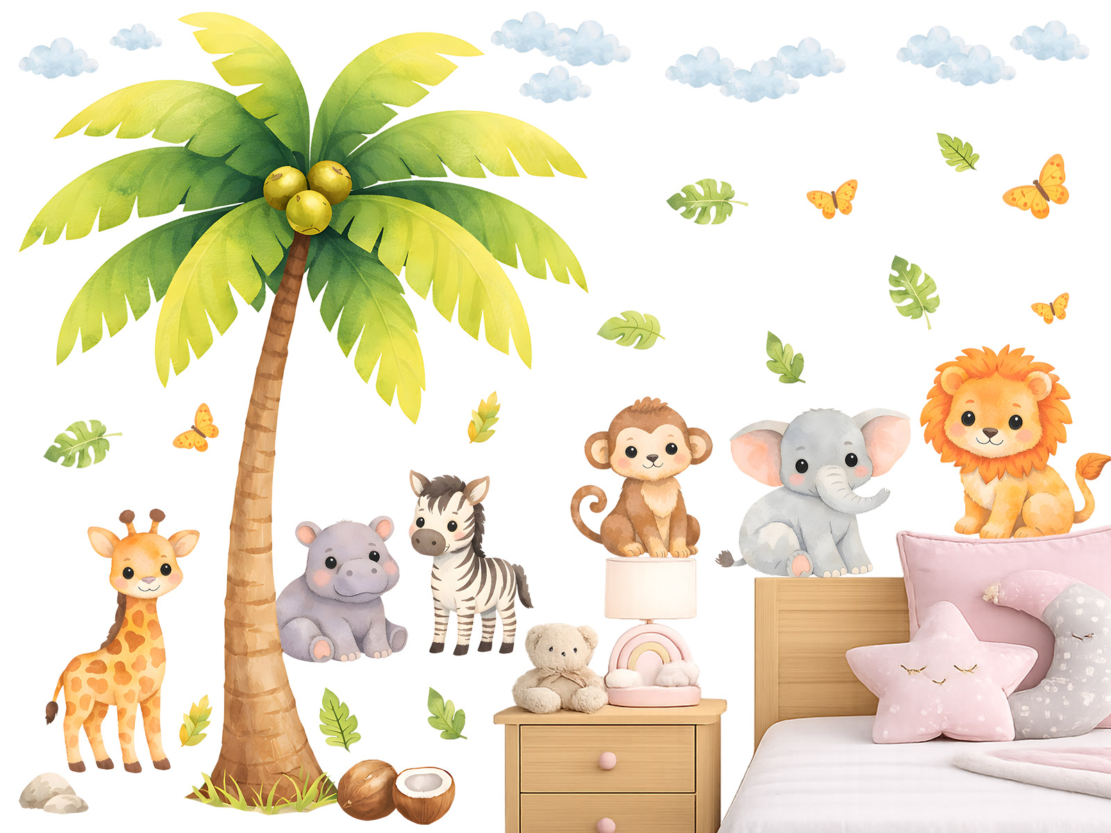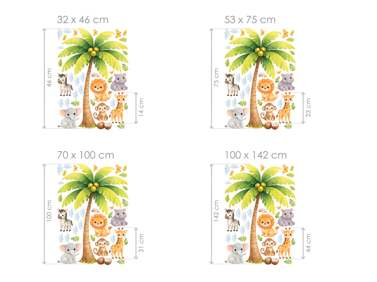 Samolepky na zeď „Exotická zvířátka a strom“ přenesou dětský pokoj do hravého světa plného tepla, barev a fantazie. Dominantní palma obklopená roztomilými safari zvířátky – žirafou, sloníkem, lvíčkem, opičkou, hrošíkem i zebrou – vytváří veselou a přívětivou scénu, která děti přirozeně vtáhne do objevování exotické přírody. Jemný malovaný styl, měkké pastelové barvy a přátelské výrazy zvířátek působí klidně a harmonicky, takže dekorace krásně doplní dětský pokoj, herničku i kout pro odpočinek. Celek nabízí vyváženou kombinaci výrazného stromu a menších samostatných motivů, díky nimž vznikne pohádková atmosféra plná radosti a fantazie.