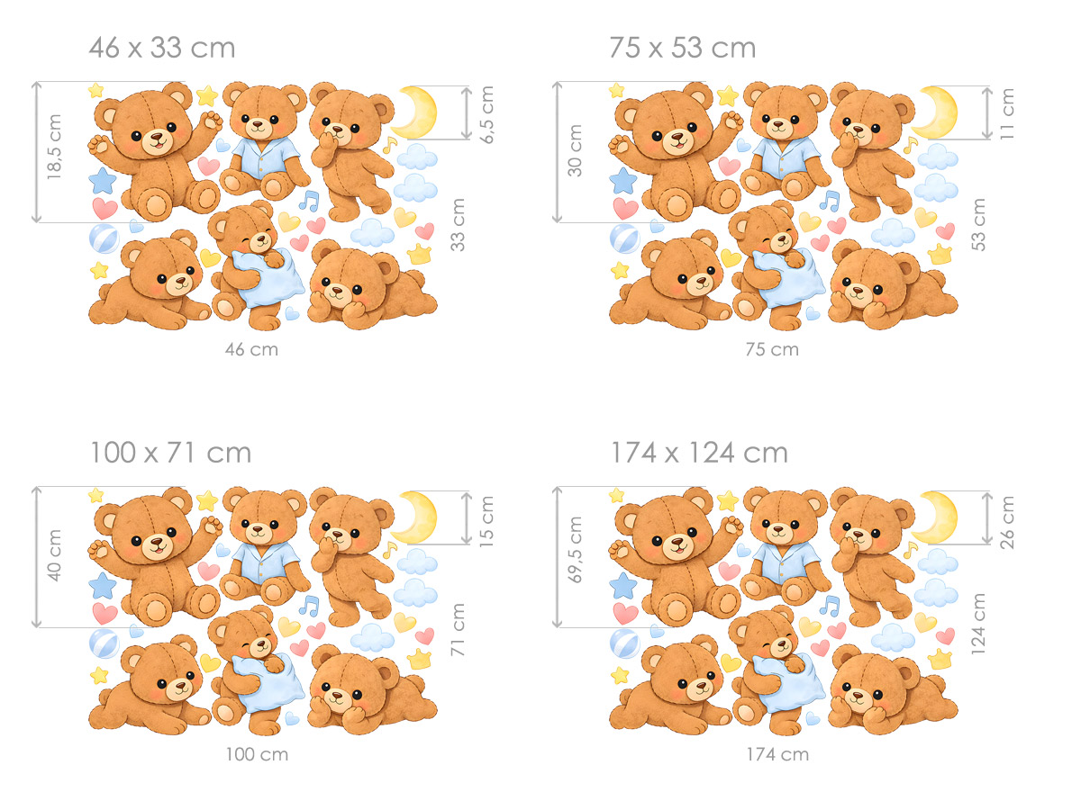 Teplé hnědé tóny medvídků v kombinaci s jemnou modrou a žlutou barvou se snadno sladí s většinou dětských interiérů. Samolepky jsou ideální nad postýlku, ke hracímu koutku nebo na prázdnou stěnu, která potřebuje oživit. Díky různým velikostem si můžete vybrat variantu přesně podle prostoru – od menší dekorace až po výrazný prvek, který promění celý pokoj v útulné místo plné fantazie a bezpečí.