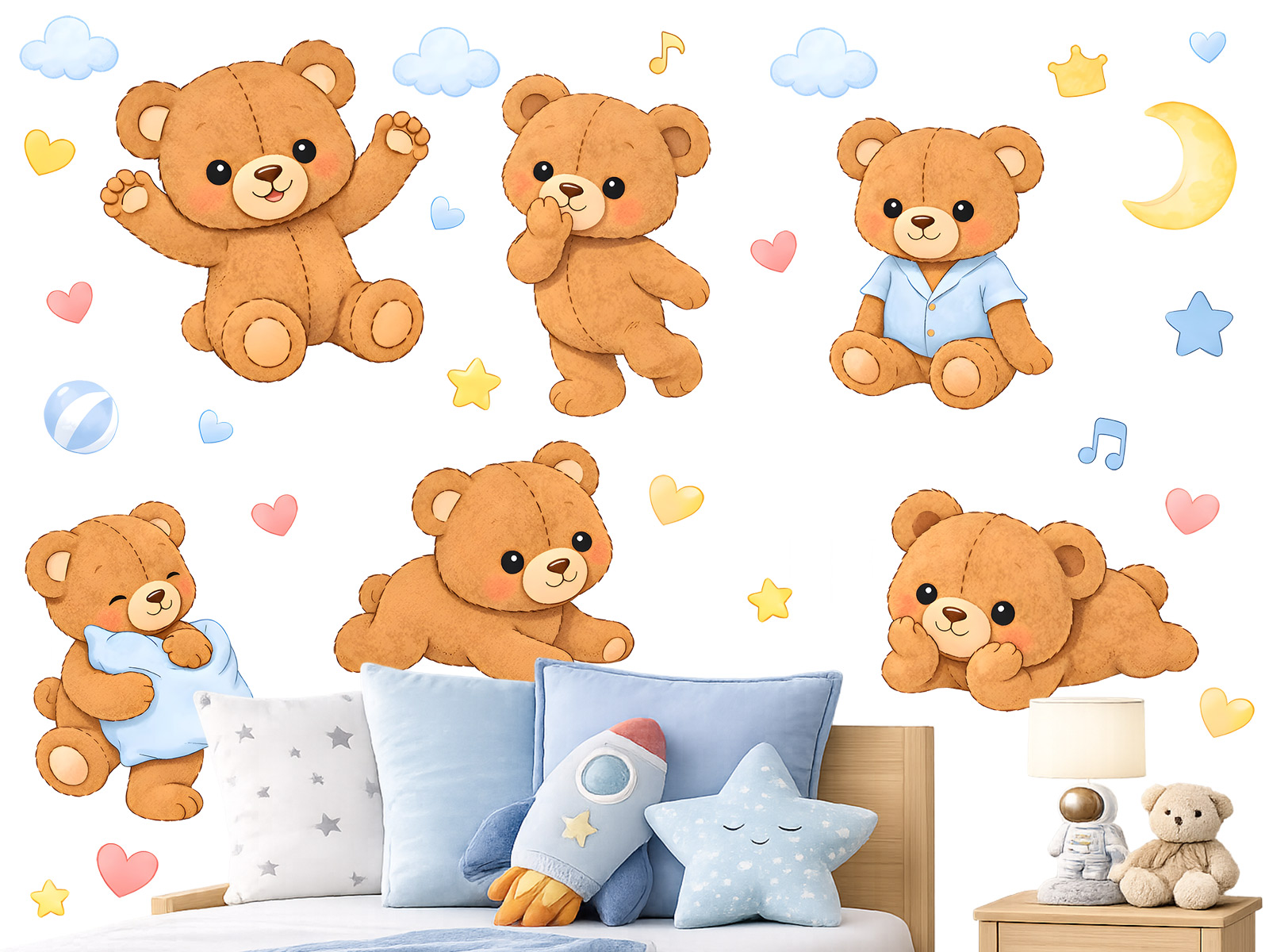 Hnědí medvídci přinášejí do dětského pokoje hřejivou atmosféru plnou radosti, něhy a hravosti. Roztomilé ilustrace medvídků v různých pozicích – hrajících si, odpočívajících i mazlících se s polštářkem – působí mile a přirozeně. Jemné pastelové doplňky v podobě srdíček, hvězdiček, měsíčku a obláčků krásně doplňují celý motiv a vytvářejí harmonický, uklidňující celek.