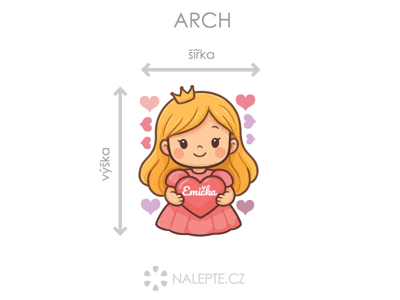 Jméno na přání v srdíčku lze samotné nebo kombinovat s datem narození nebo například věkem (tento údaj bude vycentrován pod jménem ve druhém řádku). Text zadejte ve 3. kroku objednávky do pole "poznámka". Máte-li speciální přání kontaktujte nás: info@nalepte.cz. Bude Vám zaslán náhled ke schválení emailem. Arch = takto vám budou samolepky doručeny. Každý prvek na archu je samostatná samolepka, jednotlivé části jednoduše od papírového podkladu odlepíte a nalepíte na zeď tak, aby složily výsledný motiv dle Vašich představ. Arch si můžete prohlédnout ve fotogalerii. Rozměr archu volíte v objednávce. Přehled předdefinovaných rozměrů (šířka x výška): a) arch 37 x 47 cm b) arch 59 x 75 cm c) arch 79 x 100 cm c) arch 103 x 130 cm Je možné zvolit i libovolný vlastní rozměr archu pomocí posuvníku či klikání na "Větší", "Menší" Šířka holčičky odpovídá šířce archu, výška holčičky odpovídá výšce archu