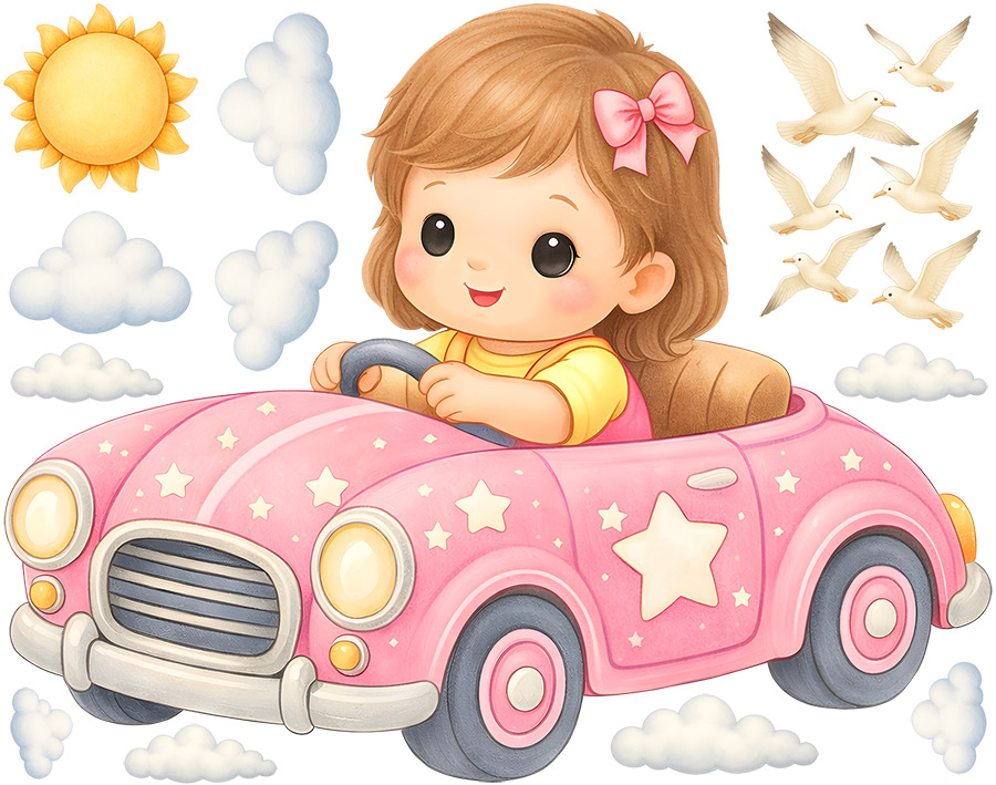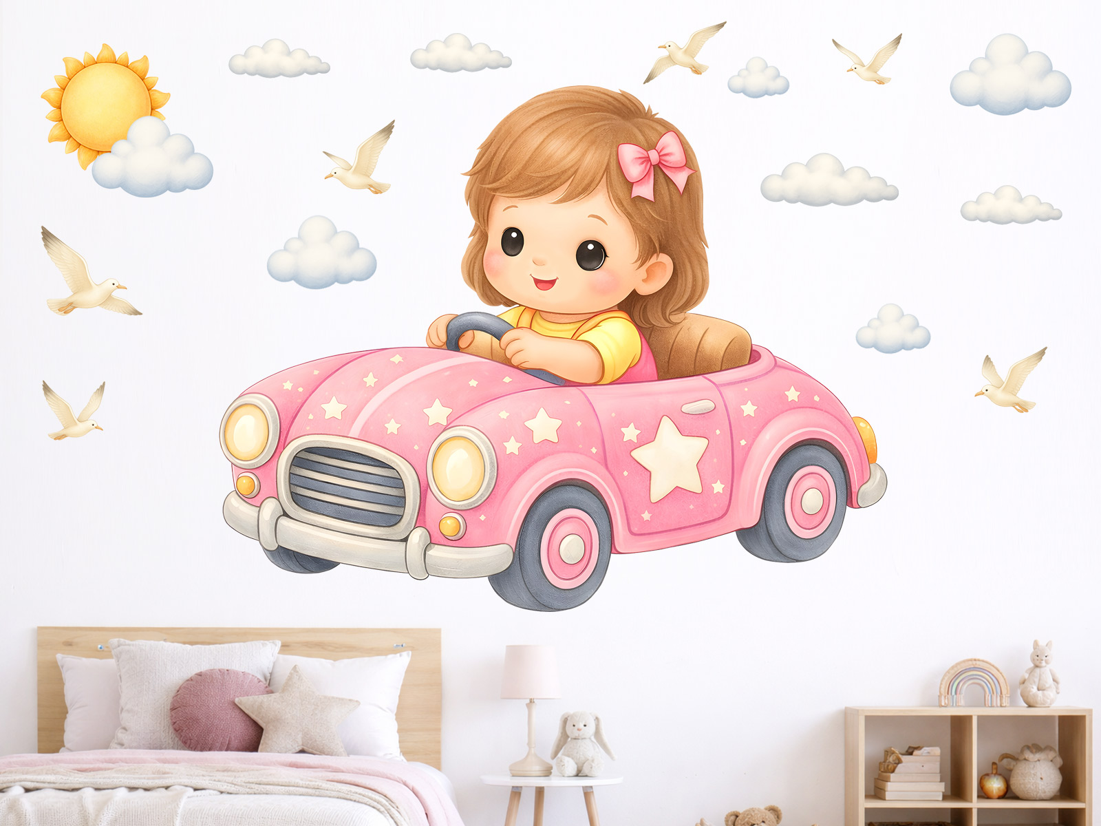 Samolepka na zeď Holčička v autíčku vnese do dětského pokoje kouzelnou atmosféru plnou něhy, radosti a fantazie. Roztomilá holčička jedoucí v růžovém autíčku působí mile a hravě, zatímco obláčky, sluníčko a poletující ptáčci dotvářejí pocit klidu a snového světa. Motiv podporuje dětskou představivost a přirozeně navozuje pocit pohody, bezpečí a radostného objevování, jako by se každý den vydávala na malé dobrodružství. Jemné pastelové barvy a měkké tvary krásně zapadnou do pokojíčku pro miminka i větší děti a snadno se sladí se světlými, neutrálními i růžově laděnými interiéry. Zákazník obdrží arch s hlavním motivem holčičky v autíčku doplněným o samostatné dekorativní prvky, díky nimž lze vytvořit harmonickou kompozici podle vlastní představy. Celý design působí jemně, hravě a nadčasově a stane se něžnou dominantou dětského pokoje.