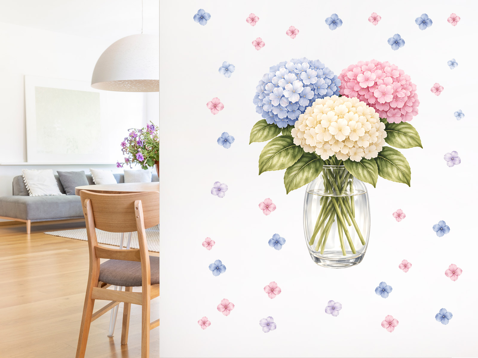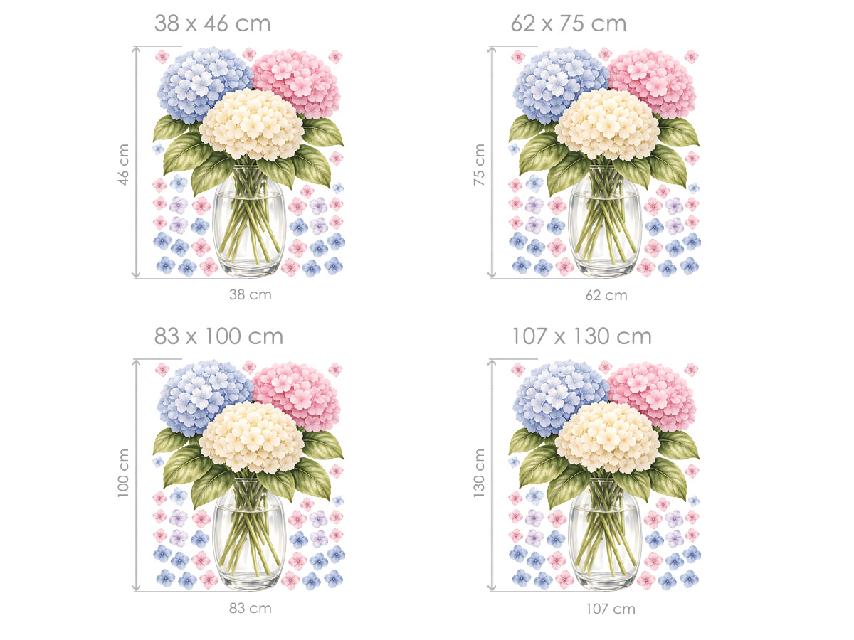 Samolepka na zeď Hortenzie ve váze vnese do vašeho interiéru jemnou eleganci a svěží nádech přírody. Bohatá kytice hortenzií v pastelových odstínech modré, růžové a krémové působí harmonicky a velmi vkusně, takže se stane přirozeným středem pozornosti v každé místnosti. Detailní akvarelové zpracování krásně zachycuje strukturu jednotlivých kvítků i přirozené barevné přechody. Průhledná skleněná váza dodává motivu lehkost a realistický vzhled, zatímco drobné rozptýlené květy kolem kompozice vytvářejí vzdušný a dekorativní efekt. Samolepka je ideální do kuchyně, jídelny, obývacího pokoje i ložnice, kde vytvoří příjemnou a uklidňující atmosféru. Díky svému nadčasovému designu se snadno kombinuje s moderním i přírodním stylem interiéru. Perfektní volba pro všechny, kdo chtějí do svého domova přinést jemnost, svěžest a romantickou květinovou krásu.