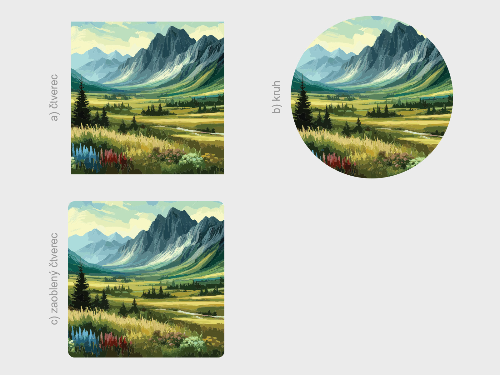 Tvar je možné změnit. Lze vybrat a) čtverec, b) kruh, c) zaoblený čtverec viz fotogalerie. Pokud tedy máte zájem o jiný tvar než na hlavní fotografii, stačí v posledním kroku objednávky do pole poznámka napsat např. "čtverec". Jedná se o tištěný samolepící plakát - imitace malby Je možné zvolit i libovolný vlastní rozměr archu pomocí posuvníku či klikání na "Větší", "Menší"