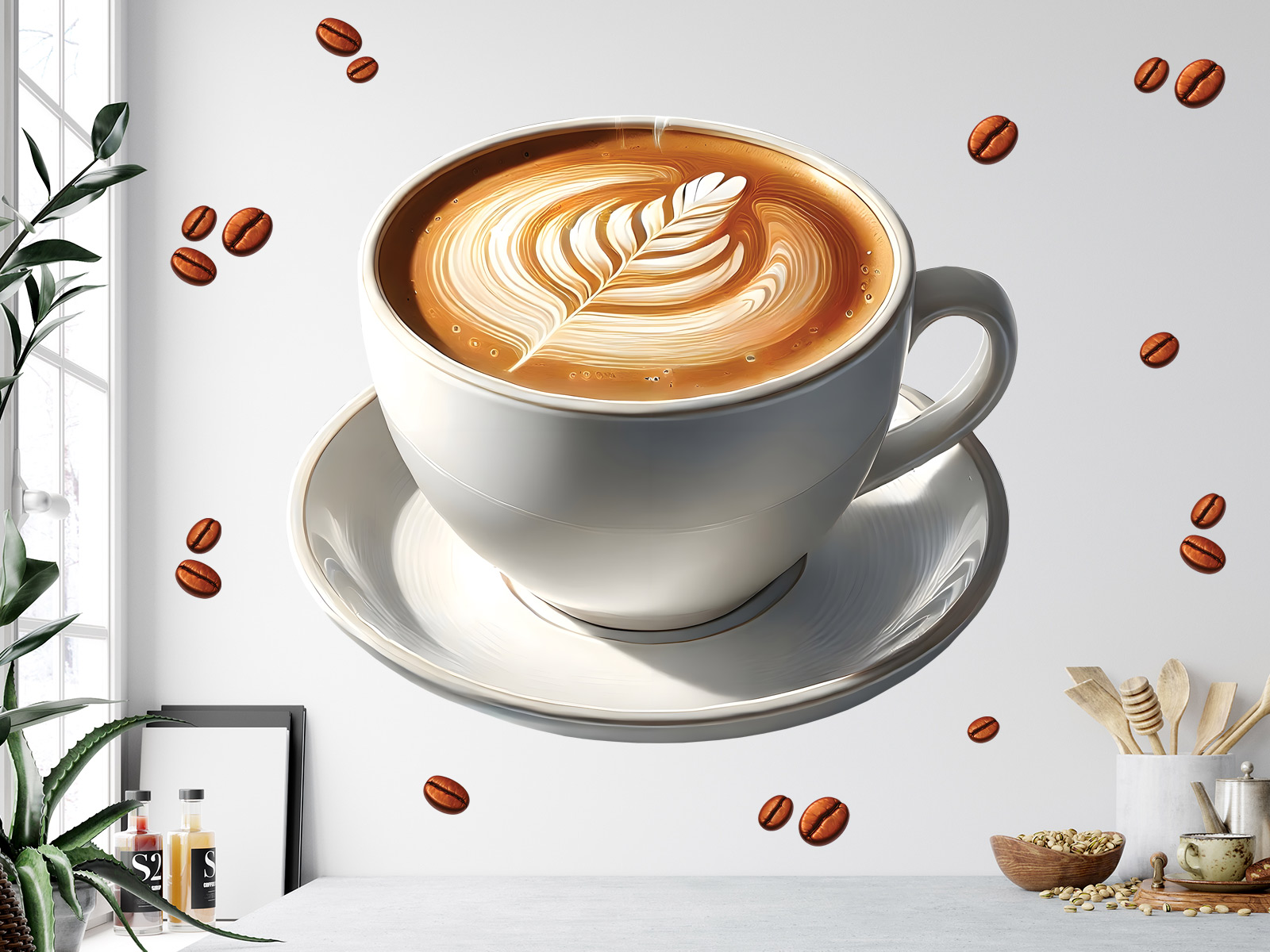 Dopřejte svému interiéru nádech kavárenské pohody! Tato sada samolepek na zeď s motivem šálku s jemnou mléčnou pěnou a zrníčky kávy je ideálním doplňkem pro kuchyně, jídelny, kavárny nebo kanceláře. Realistický vzhled, měkké světlo a elegantní barvy vytváří pocit tepla a domácí pohody. Co sada obsahuje: - 1× detailní motiv hrnku s kávou - několik zrnek kávy různých velikostí pro volné rozmístění na zeď