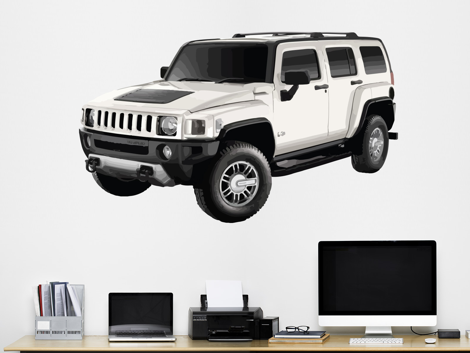 Samolepka na zeď „Hummer“ přináší do interiéru ikonický vzhled legendárního terénního vozu, který je symbolem síly, odolnosti a sebevědomého stylu. Robustní proporce, výrazná maska chladiče a precizně zpracované detaily dávají vozu autentický a realistický výraz, díky kterému působí na zdi dominantně a nepřehlédnutelně. Design samolepky skvěle vynikne v dětském pokoji, studentském koutě i moderním interiéru, kde dodá prostoru dobrodružnou atmosféru a nádech americké drsnosti. Ideální volba pro všechny fanoušky velkých aut, off-roadů a silných strojů, kteří chtějí svůj prostor oživit výrazným a stylovým motivem.