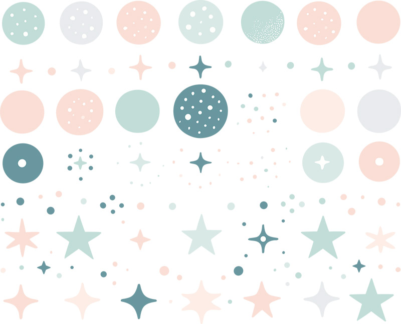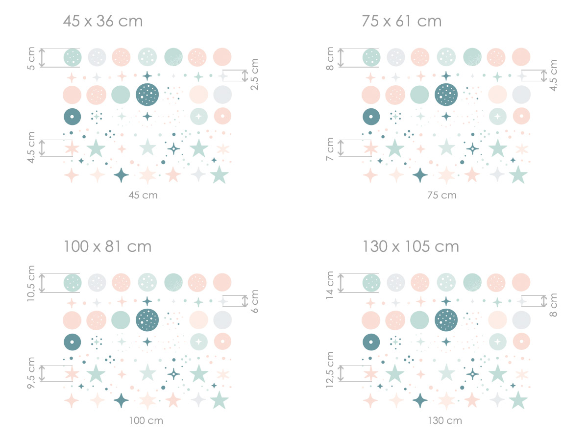Samolepka na zeď „Hvězdičky a puntíky“ vnáší do dětského pokoje jemnou, klidnou atmosféru plnou lehkosti a fantazie. Kombinace pastelových hvězdiček, puntíků a drobných dekorativních tvarů vytváří harmonický celek, který prostor příjemně oživí, aniž by působil rušivě. Díky samostatným motivům lze jednotlivé prvky rozmístit volně podle vlastní představy a přizpůsobit je velikosti i uspořádání pokoje. Decentní barevnost se krásně hodí do moderních i skandinávsky laděných interiérů a podporuje pocit pohody, klidu a bezpečí. Tato sada je ideální volbou pro miminka i malé děti a vytvoří útulné prostředí, ve kterém se budou cítit dobře při hraní i odpočinku.