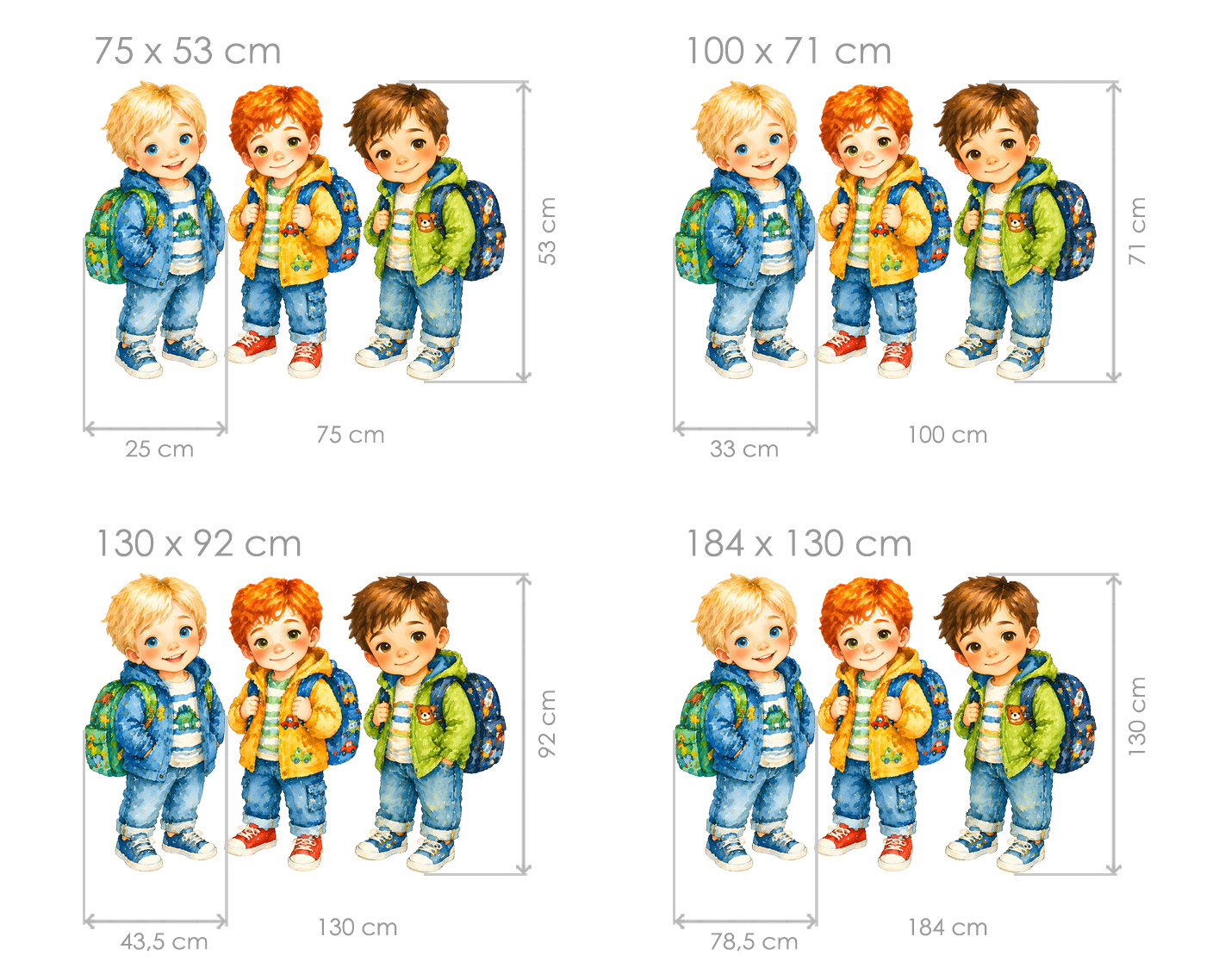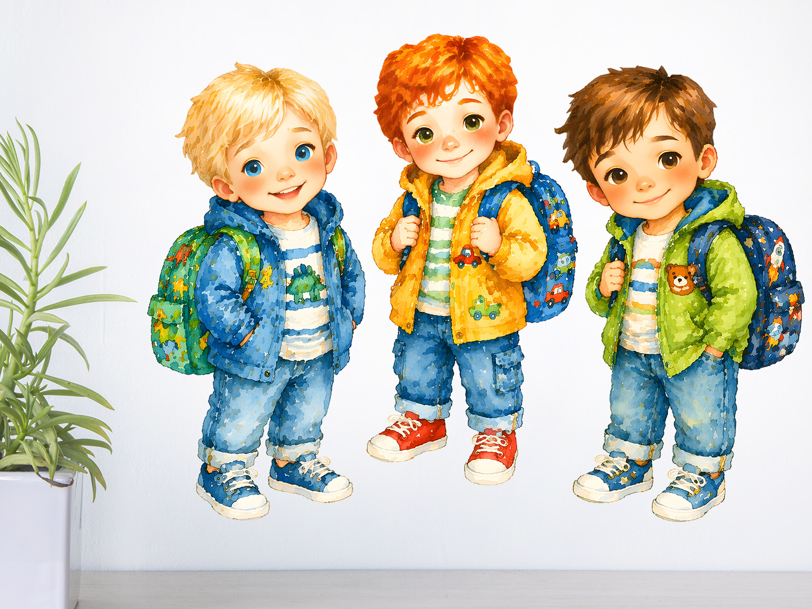 Samolepky na zeď Kluci ze školky přináší veselý a hravý motiv plný dětské energie a radosti. Tři roztomilí chlapečci s batůžky působí přátelsky a přirozeně, takže krásně oživí každý dětský pokoj. Akvarelové zpracování dodává ilustracím jemnost a měkké barevné přechody. Detailní oblečení s hravými motivy a milé výrazy tváří vytvářejí útulnou a pozitivní atmosféru. Motiv je ideální do pokojíčku menších dětí, do herního koutku nebo školky, kde podpoří pocit pohody, kamarádství a každodenní dobrodružství. Skvělá volba pro malé kluky, kteří milují barvy, objevování a svět plný fantazie.