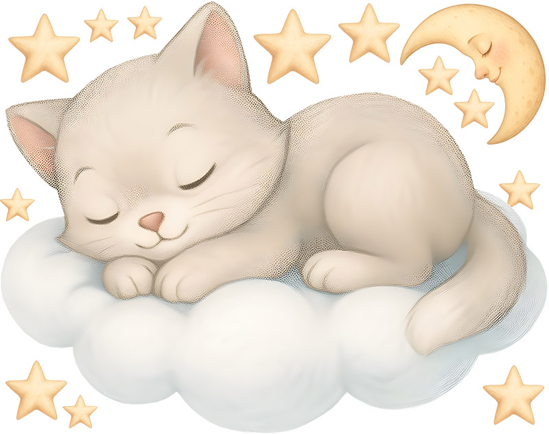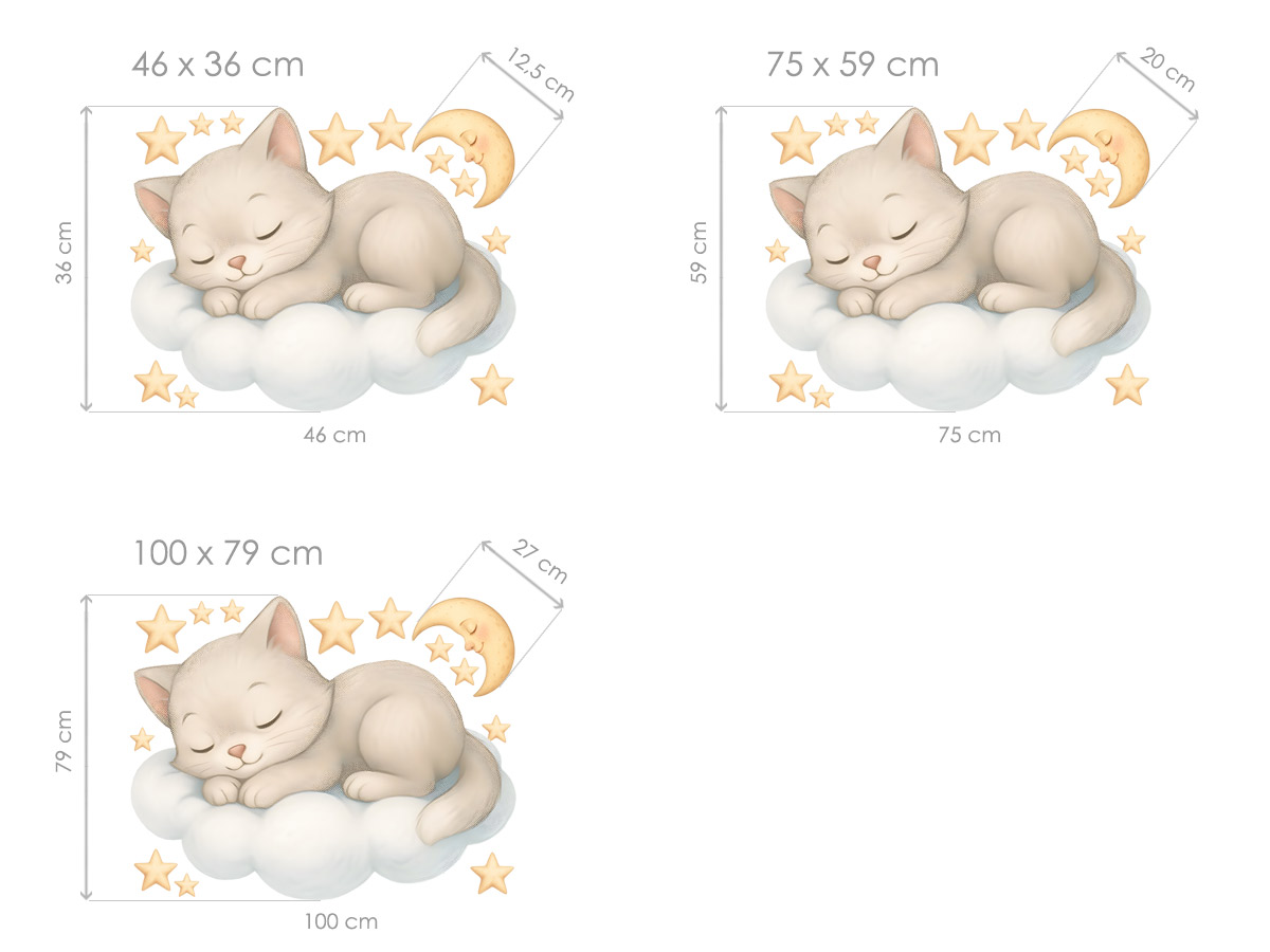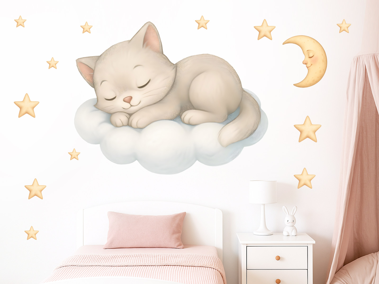 Samolepka na zeď „Kočka na obláčku“ vnese do dětského pokojíčku něhu, klid a pohádkovou atmosféru. Roztomilá spící kočička stočená na nadýchaném bílém obláčku působí jemně, přátelsky a dokonale zapadne do interiérů laděných v pastelových odstínech. Decentní hvězdičky a měsíček celý motiv krásně doplňují a vytvářejí harmonickou kompozici, která uklidňuje a podporuje příjemné usínání. Na archu, který zákazník obdrží, je kompletní sada prvků připravených k jednoduché aplikaci – jednotlivé části lze rozmístit podle vlastního vkusu, takže výsledné dekorace mohou být vždy originální.