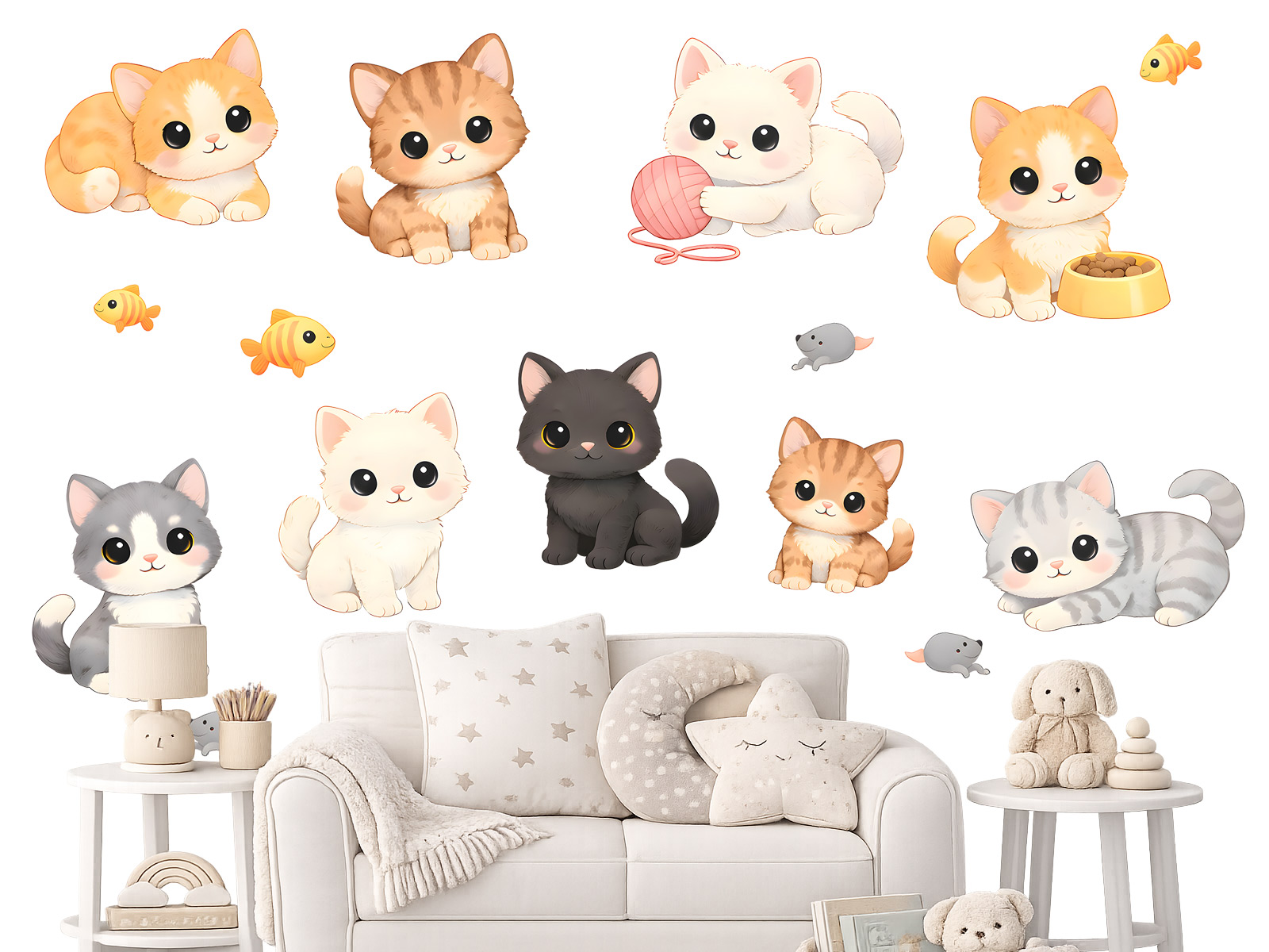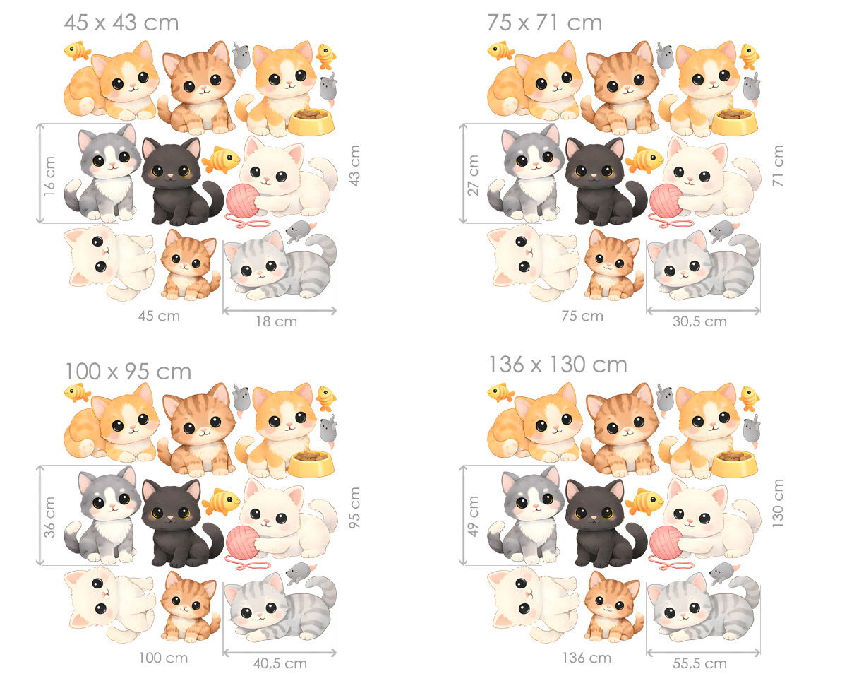 Textilní přelepitelné samolepky kočky a kočičky přinesou do dětského pokoje roztomilou a hravou atmosféru. Veselé ilustrace malých koťátek v různých barvách a pózách působí mile a přátelsky, takže se stanou krásnou dekorací, která potěší každého malého milovníka zvířátek. Na samolepkách najdete různá koťátka – hravá, zvědavá i odpočívající. Některá si hrají s klubíčkem, jiná sedí nebo si zvědavě prohlížejí své okolí. Motiv doplňují drobné detaily, jako jsou malé rybičky nebo myšky, které celé scéně dodávají ještě více hravosti. Dekorace se skvěle hodí do dětských pokojů, pokojů pro miminka i do hracích koutků. Kočičky můžete rozmístit podle vlastní fantazie – nad postel, kolem nábytku nebo po celé stěně a vytvořit tak veselou scénu plnou roztomilých zvířátek.