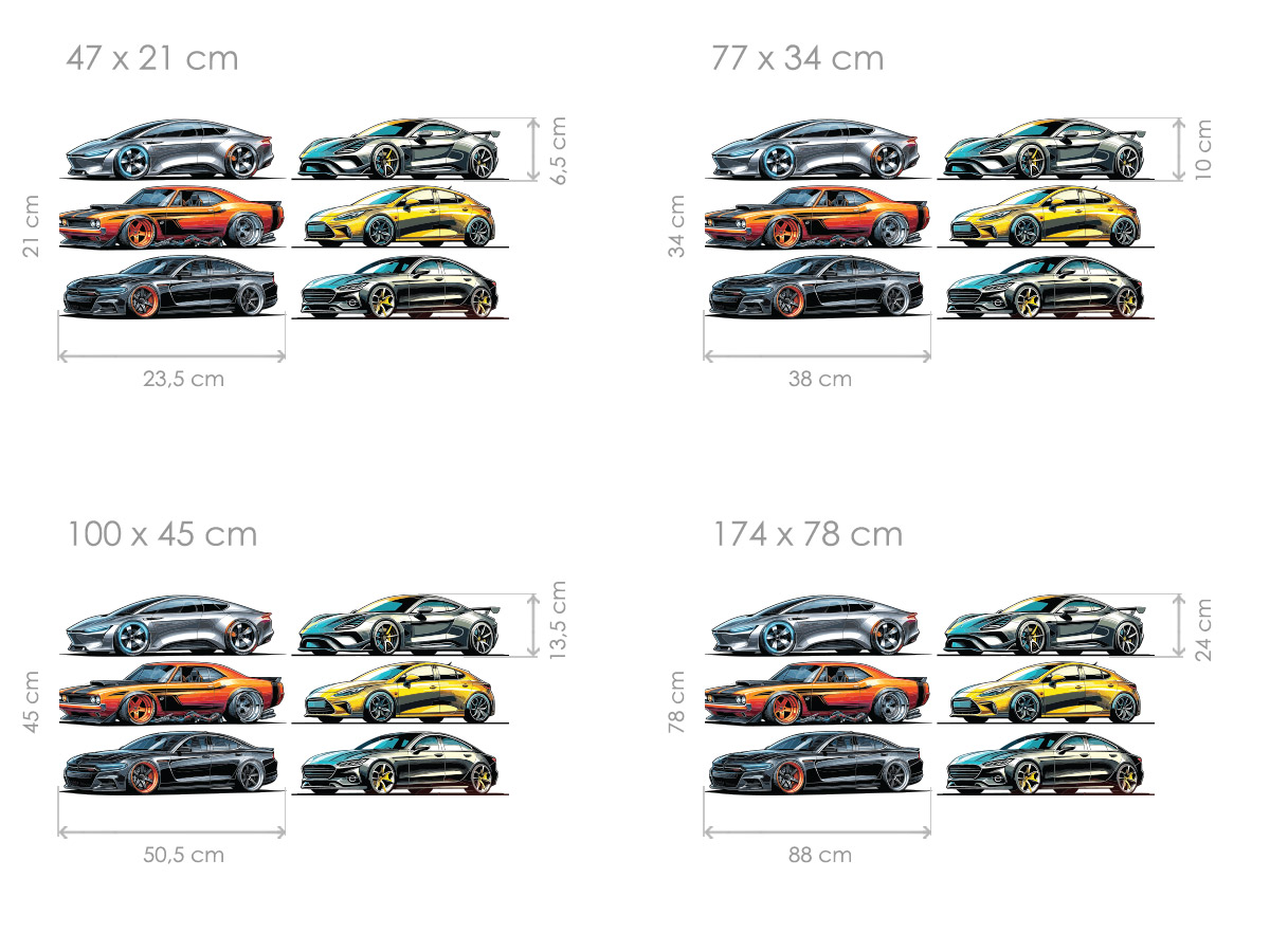 Samolepka na zeď „Kolekce aut“ přináší na stěnu pestrý výběr stylových automobilů, které nadchnou každého malého i velkého fanouška motorů. Dynamická sada různých typů aut v moderním ilustrativním pojetí působí hravě, ale zároveň detailně a propracovaně, takže skvěle oživí dětský pokoj, herní koutek i prostor pro malé závodníky. Díky rozmanitosti tvarů a barev lze jednotlivá auta na stěně rozmístit podle vlastní fantazie a vytvořit originální kompozici, která dodá interiéru energii, pohyb a osobitý styl. Sada působí jako ucelený designový prvek, který podporuje dětskou představivost, lásku k autům a radost z objevování.