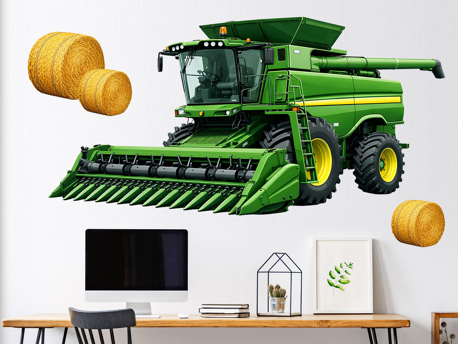 Samolepka na zeď „Kombajn“ přináší do dětského pokoje nebo herního koutku působivý motiv moderní zemědělské techniky, která zaujme každého malého milovníka traktorů a práce na poli. Detailně zpracovaný zelený kombajn s typickým žacím ústrojím a doplňkovými balíky slámy působí realisticky, přehledně a zároveň hravě, takže krásně podněcuje dětskou fantazii a chuť objevovat svět zemědělství. Díky samostatným prvkům lze vytvořit vlastní scénu sklizně a přizpůsobit si rozmístění podle prostoru i představ dítěte, ať už kombajn „pracuje“ nad postelí, u psacího stolu nebo na velké volné stěně. Tento motiv se skvěle hodí jako výrazná dekorace pro malé farmáře, která dodá interiéru dynamiku, barvu a dobrodružnou atmosféru venkova.