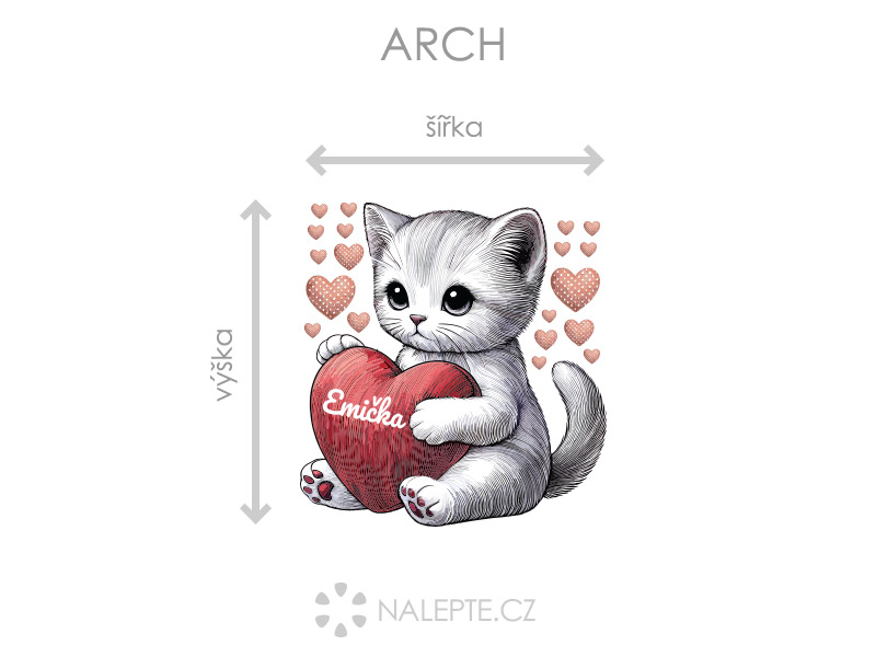 Jméno na přání v srdíčku lze samotné nebo kombinovat s datem narození nebo například věkem (tento údaj bude vycentrován pod jménem ve druhém řádku). Text zadejte ve 3. kroku objednávky do pole "poznámka". Máte-li speciální přání kontaktujte nás: info@nalepte.cz. Bude Vám zaslán náhled ke schválení emailem. Arch = takto vám budou samolepky doručeny. Každý prvek na archu je samostatná samolepka, jednotlivé části jednoduše od papírového podkladu odlepíte a nalepíte na zeď tak, aby složily výsledný motiv dle Vašich představ. Arch si můžete prohlédnout ve fotogalerii. Rozměr archu volíte v objednávce. Přehled předdefinovaných rozměrů (šířka x výška): a) arch 44 x 46 cm b) arch 71 x 75 cm c) arch 95 x 100 cm c) arch 123 x 130 cm Je možné zvolit i libovolný vlastní rozměr archu pomocí posuvníku či klikání na "Větší", "Menší" Šířka koťátka odpovídá šířce archu, výška koťátka odpovídá výšce archu